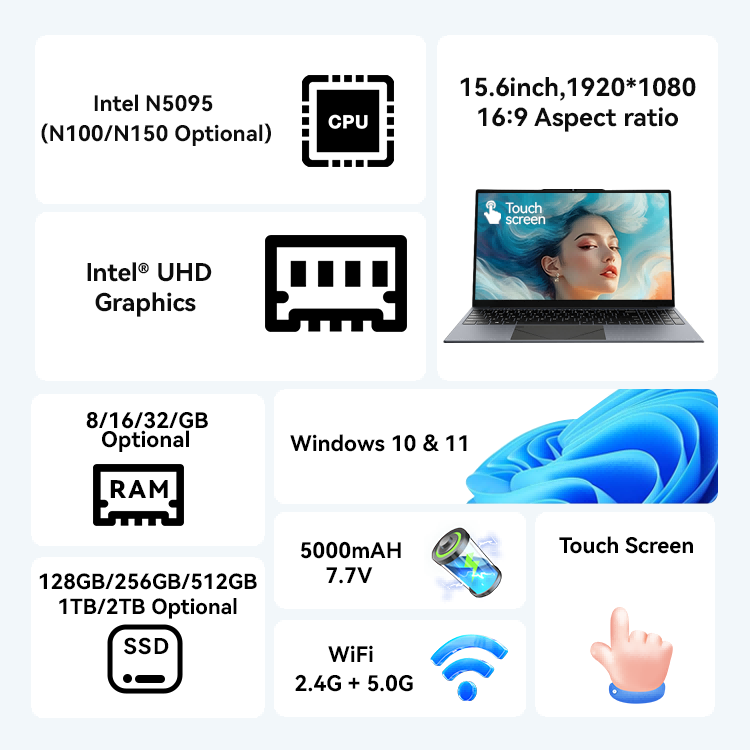 Portátiles de 15.6 Pulgadas, Intel N5095, Gráficos UHD, RAM de 16 GB, SSD de 128 GB, Pantalla IPS de 1920*1080, Huella Dactilar, Portátil para Estudiantes y Negocios