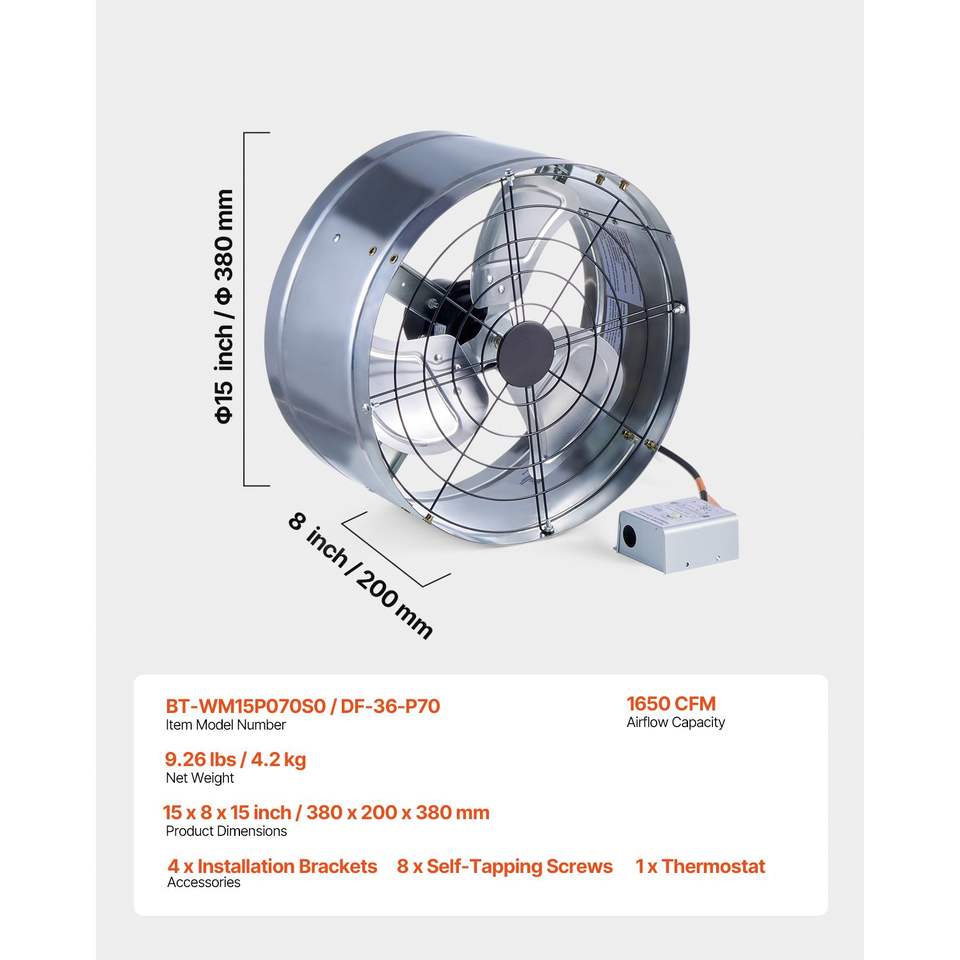 Ventilador de Extracción para Ático de 15 Pulgadas con Montaje en Pared, Termostato Ajustable y Malla Exterior, 1300 CFM, Ventilador para Casa, Enfría 185
