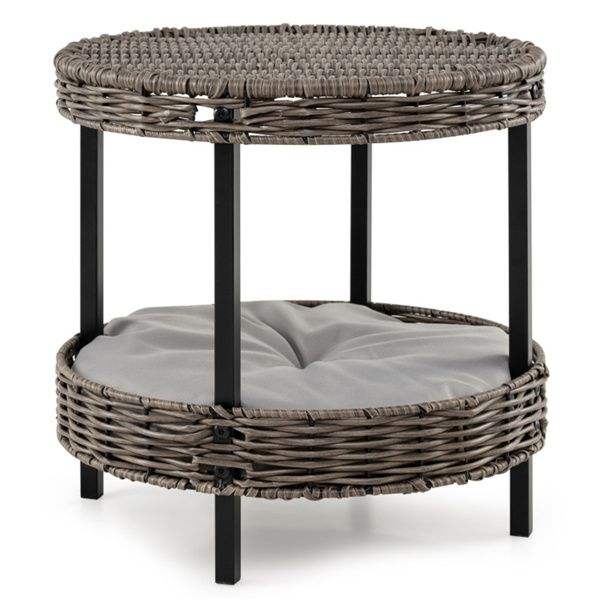 Cama para Gatos de Ratán de 2 Niveles de 15 x 15 Pulgadas con Cojín Acolchado Lavable, Patas de Metal, Acabado Gris, Capacidad de 66 Libras, Casas y Muebles para Mascotas