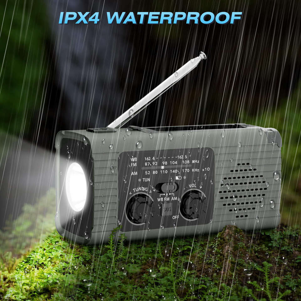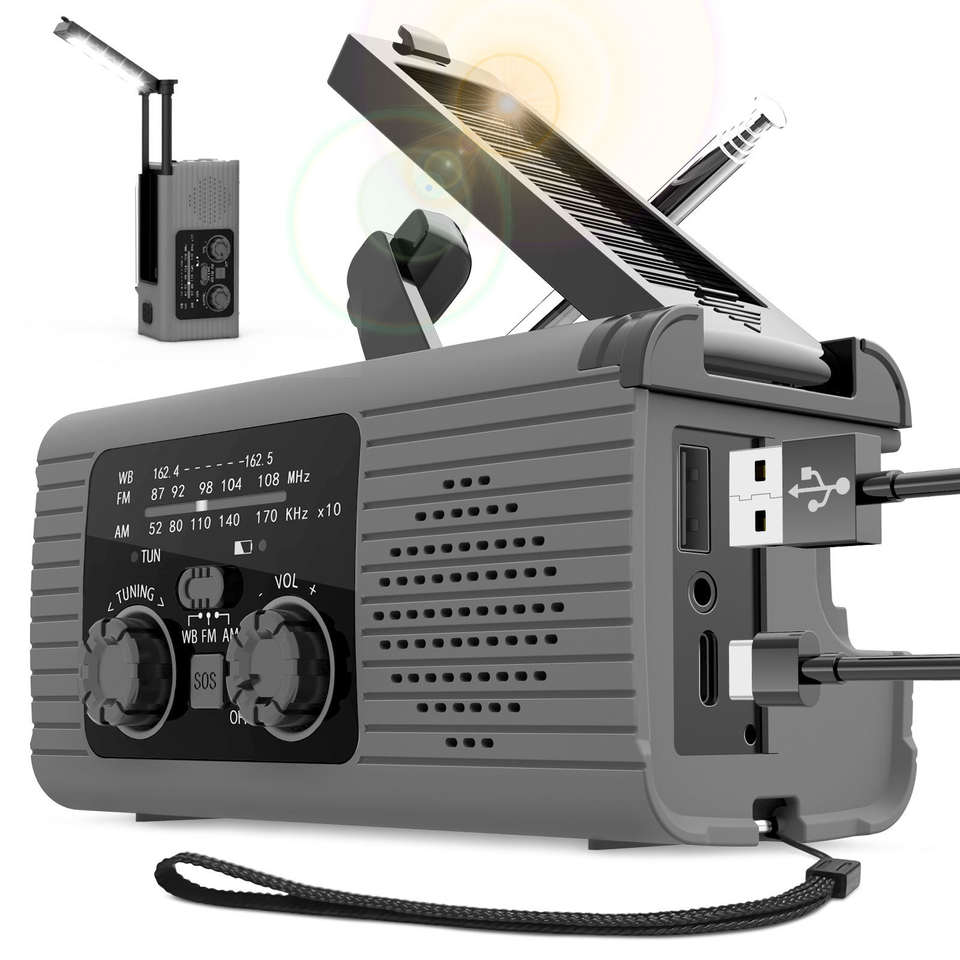 Banco de Energía de 1500mAh de Fábrica, Radio Multifunción AM FM NOAA con Carga Solar y Manivela, Radio Meteorológica, Luz LED Dual