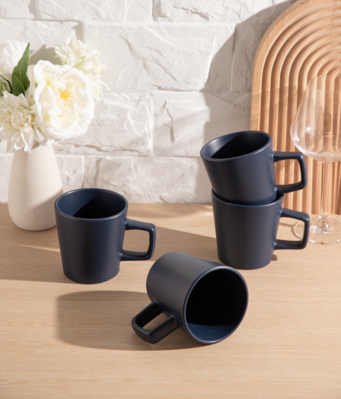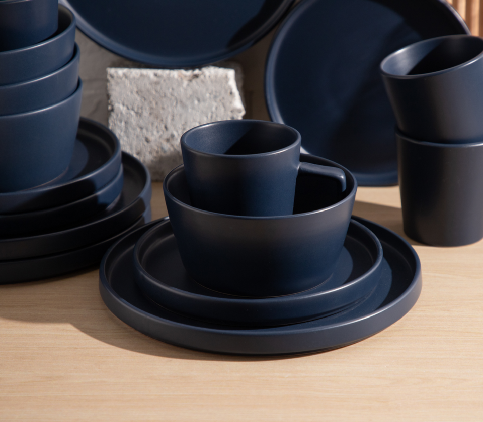 Juego de vajilla de cerámica azul oscuro mate de 16 piezas, juego de platos, tazones y tazas redondos modernos y minimalistas para el hogar y la cocina.
