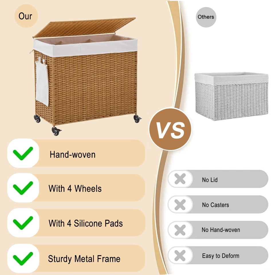 Cesto de Ropa Sucia con Ruedas de Mimbre Tejido de 3 Secciones y 165L, con Tapa y Ruedas