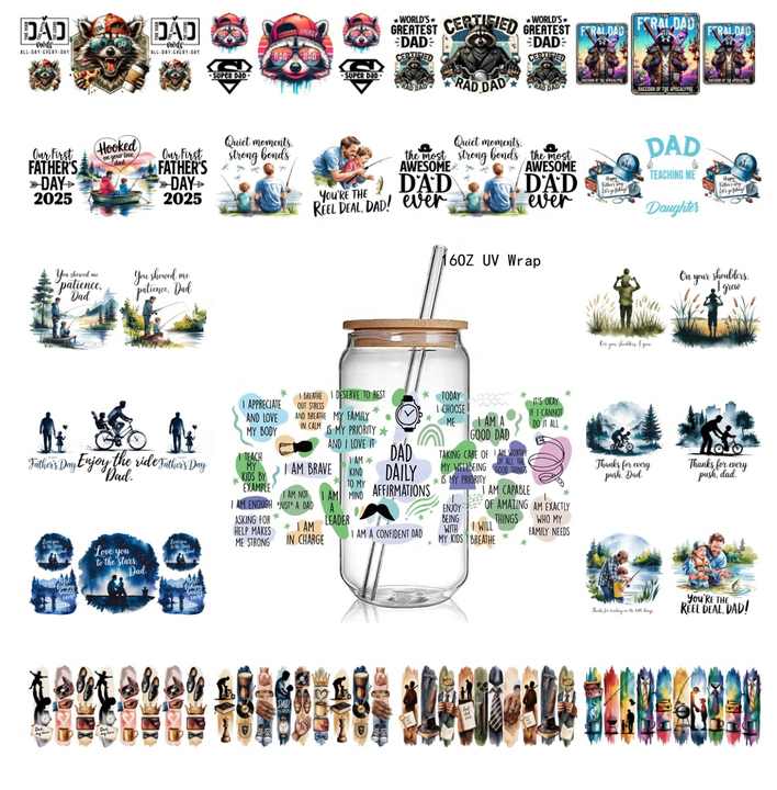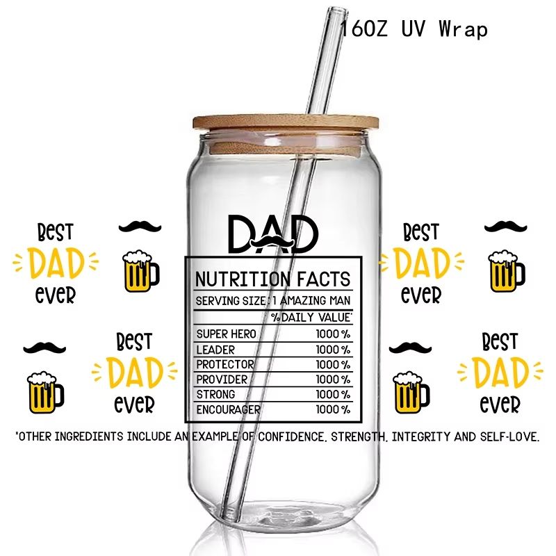 16oz Día del Padre Libbey Glass Can Wrap Calcomanía Papá Afirmaciones diarias Lata de vidrio Pegatinas de envoltura completa Best Dad Ever UV DTF Wrap Gift