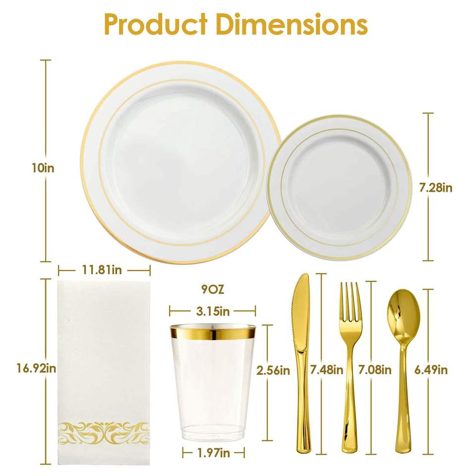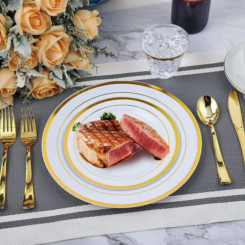 Juego de Vajilla Desechable Dorado de 175 Piezas, Platos de Plástico con Borde Dorado, Tazas, Tenedores, Cucharas, Cuchillos, Servilletas de Papel para Fiestas, Bodas, Graduaciones