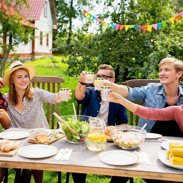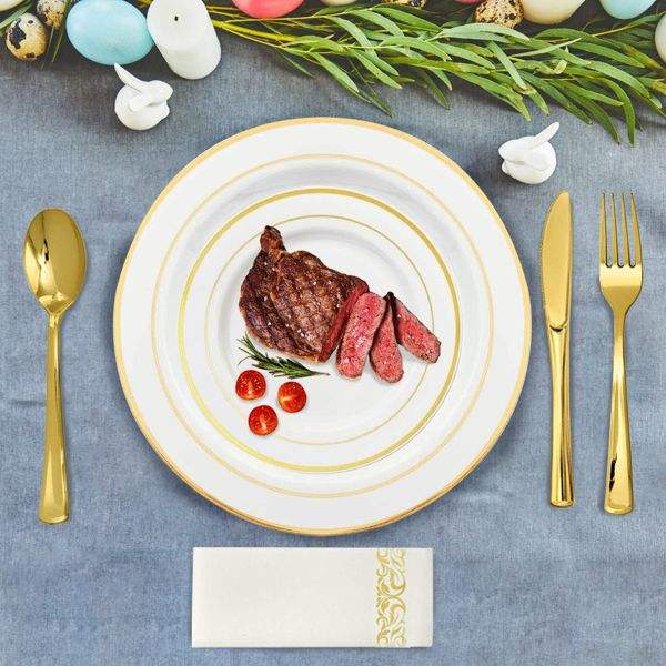 Juego de Vajilla Desechable Dorado de 175 Piezas, Platos de Plástico con Borde Dorado, Tazas, Tenedores, Cucharas, Cuchillos, Servilletas de Papel para Fiestas, Bodas, Graduaciones