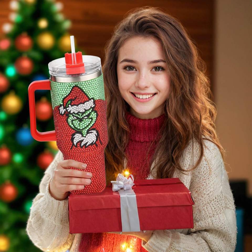 Vasos de Acero Inoxidable de 17 oz con Pedrería Brillante de Grinch, Vasos con Pedrería de Grinch para Regalos de Navidad