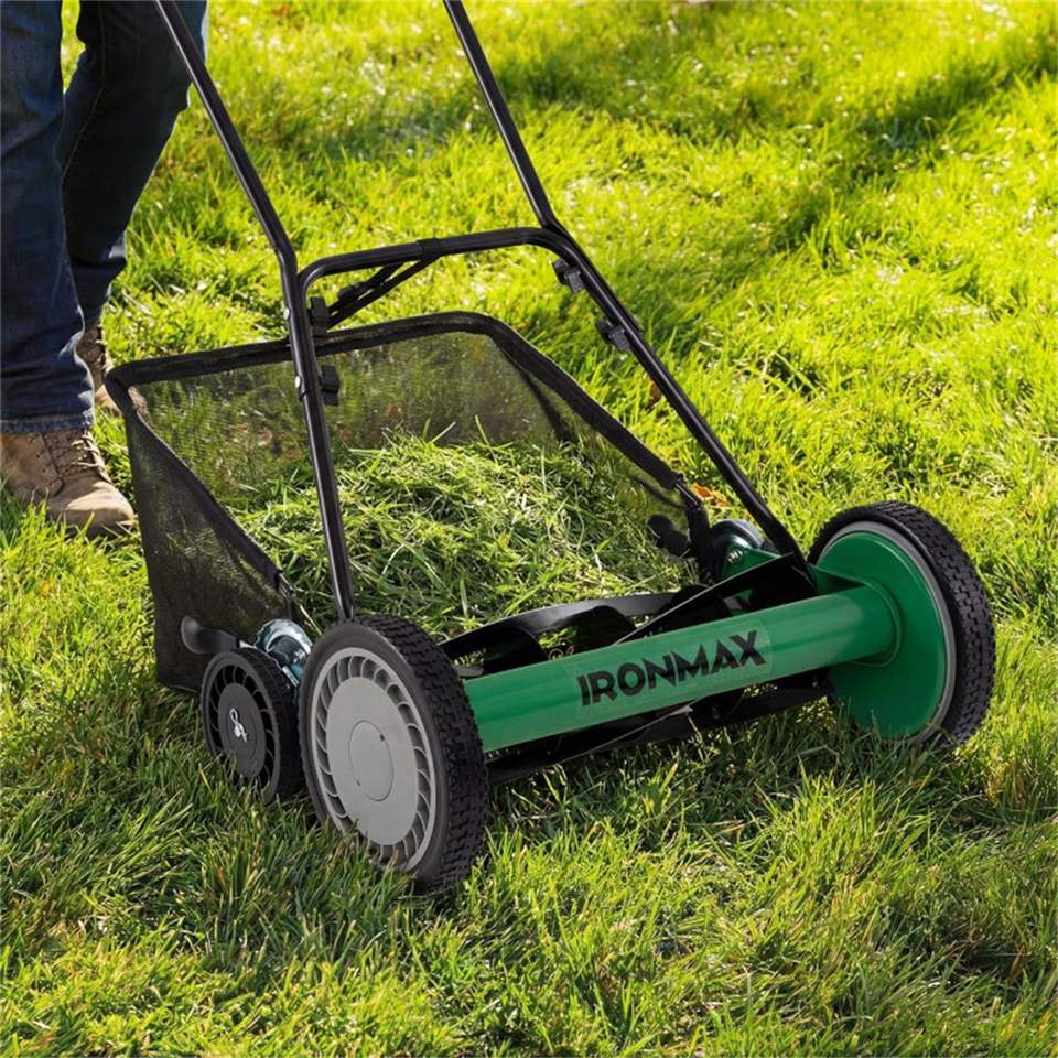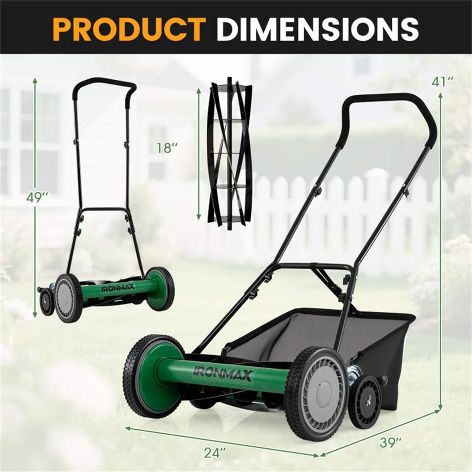 Cortacésped manual de 18 pulgadas con 5 cuchillas, de empuje, con 4 niveles de ajuste de altura, verde, con recogedor de césped
