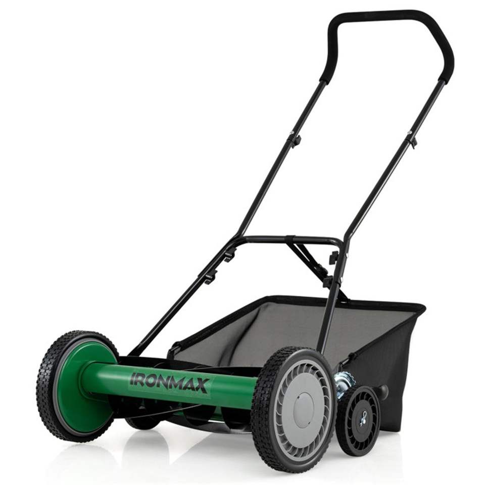 Cortacésped manual de 18 pulgadas con 5 cuchillas y recogedor de césped verde, con ajuste de altura de 4 niveles