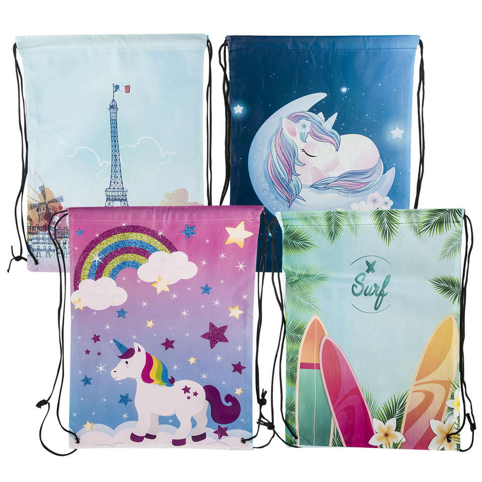 Bolsa Deportiva con Cordón Ajustable de Poliéster Ecológico de 18'' con Estampado - 4 Surtidos de Bolsas Promocionales para Deportes y Fitness