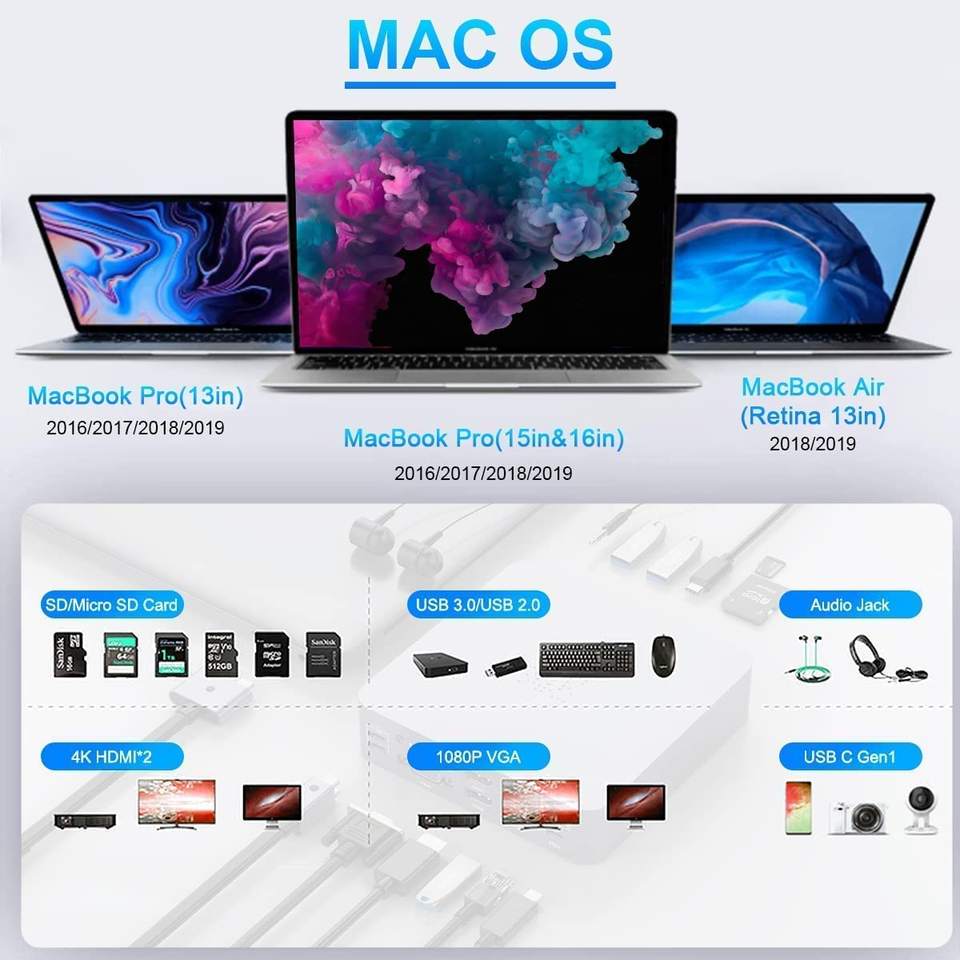 Adaptador multipuerto de Triple pantalla, estación de acoplamiento USB C, Hub USB para MacBook Pro, 18 en 1, HDMI, DP, RJ45LAN 4K