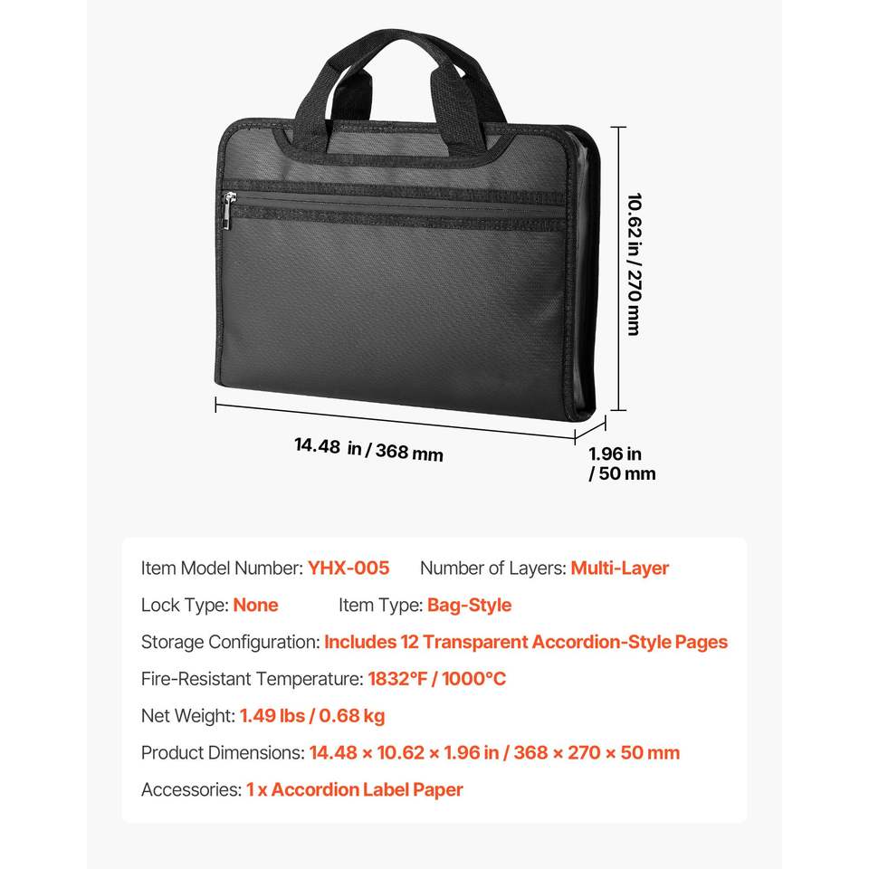 Bolsa de Almacenamiento de Archivos Multicapa Portátil 1832 F, Resistente al Fuego, Aislada Térmicamente, Impermeable, para Organización Segura de Documentos