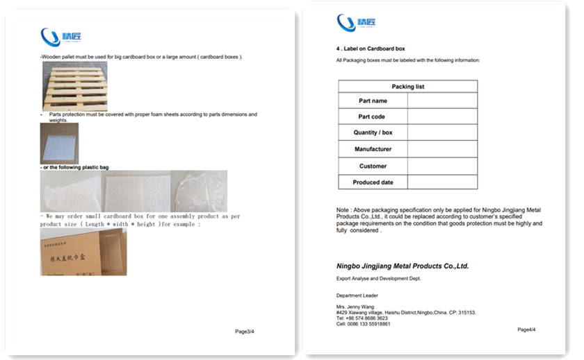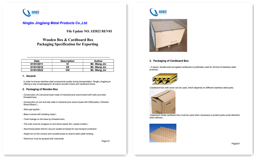 Ningbo Jingjiang productos metálicos Co., ltd. tiene más de veinte años de experiencia en la exportación de componentes de acero inoxidable a la mayoría de los países con requisitos de embalaje muy estrictos basados en nuestro estándar de embalaje internacional para evitar daños a los productos de acero inoxidable durante el transporte múltiple. Los clientes están muy satisfechos con nuestro embalaje y consulte a continuación nuestro embalaje estándar en detalles y si tiene alguna solución de embalaje preferida, también estamos invitados a aprender de usted.