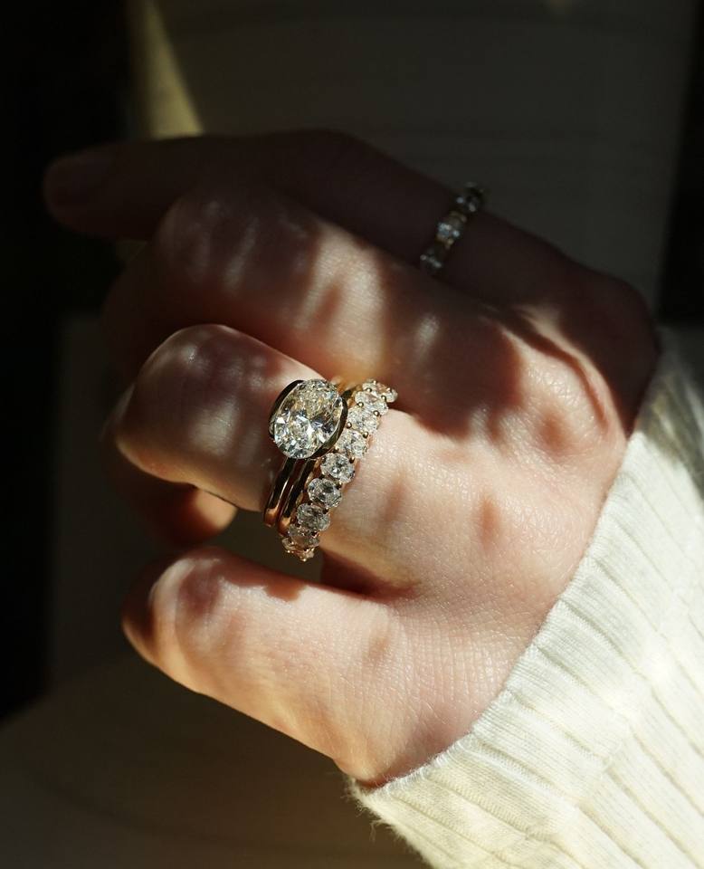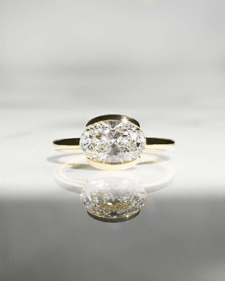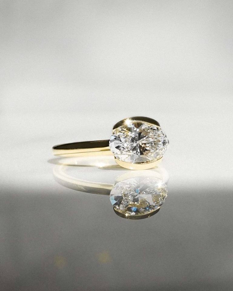 18K oro East West solitario compromiso boda promesa anillo 2.0CTW Oval Lab crecido diamante medio bisel conjunto joyería fina fiestas