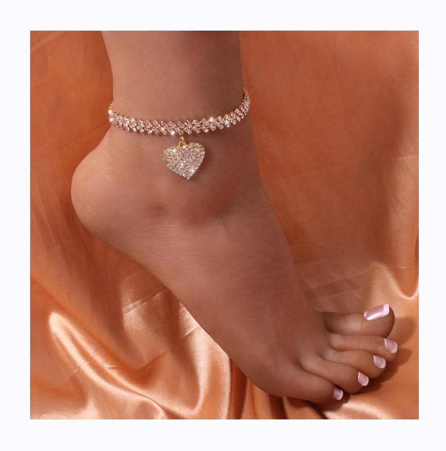 Pulsera de tobillo de corazón de diamantes de imitación de cristal brillante de varias filas chapada en oro de 18 quilates para mujer