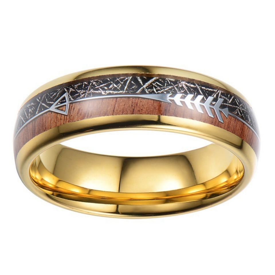 Anillo de Acero Inoxidable y Titanio con Baño de Oro de 18K, Diseño de Espina de Pescado en Madera de Acacia y Alambre Plateado Electrochapado de 6mm, Acero de Tungsteno
