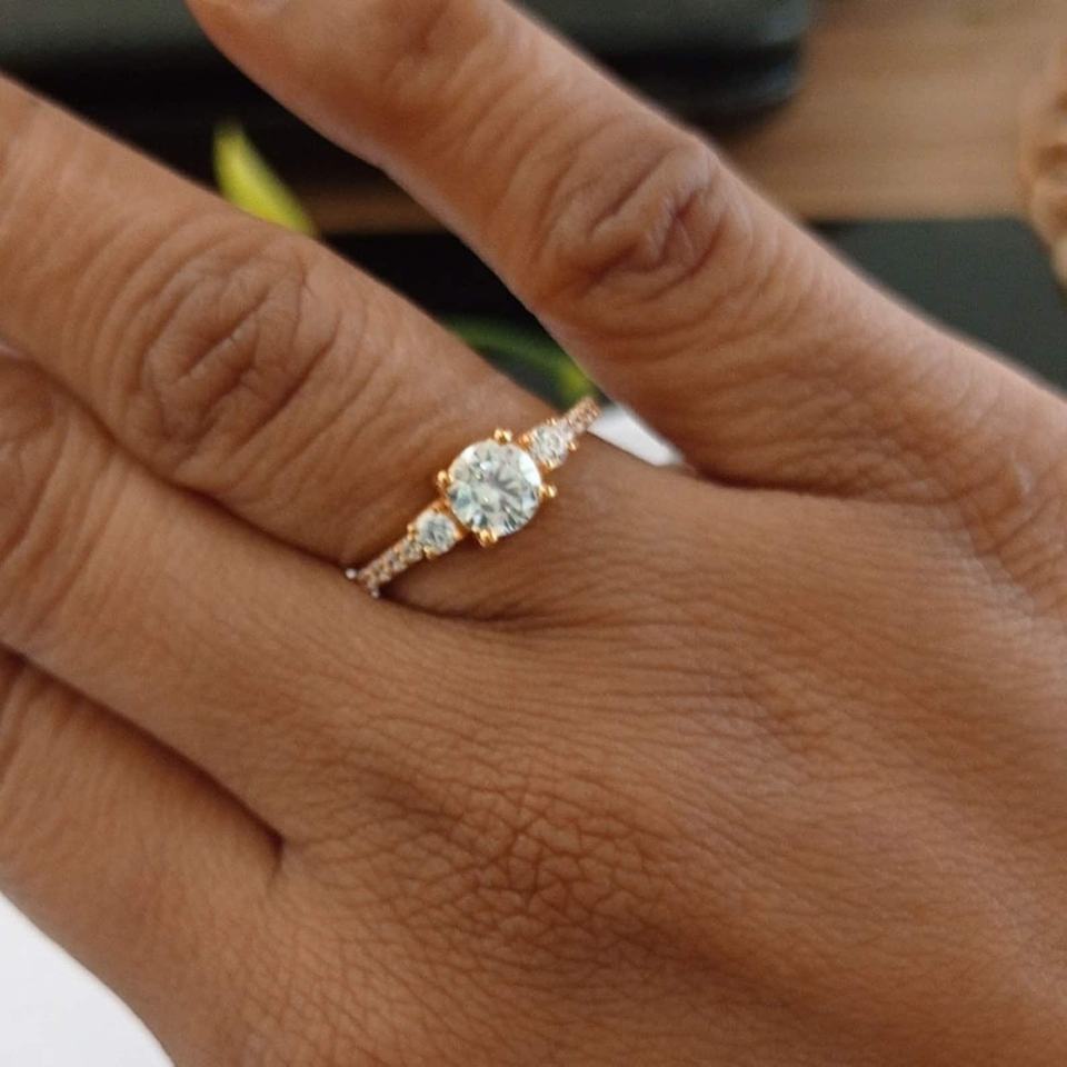 18K oro amarillo 7,00 MM corte redondo Moissanite anillo de compromiso 3 piedras