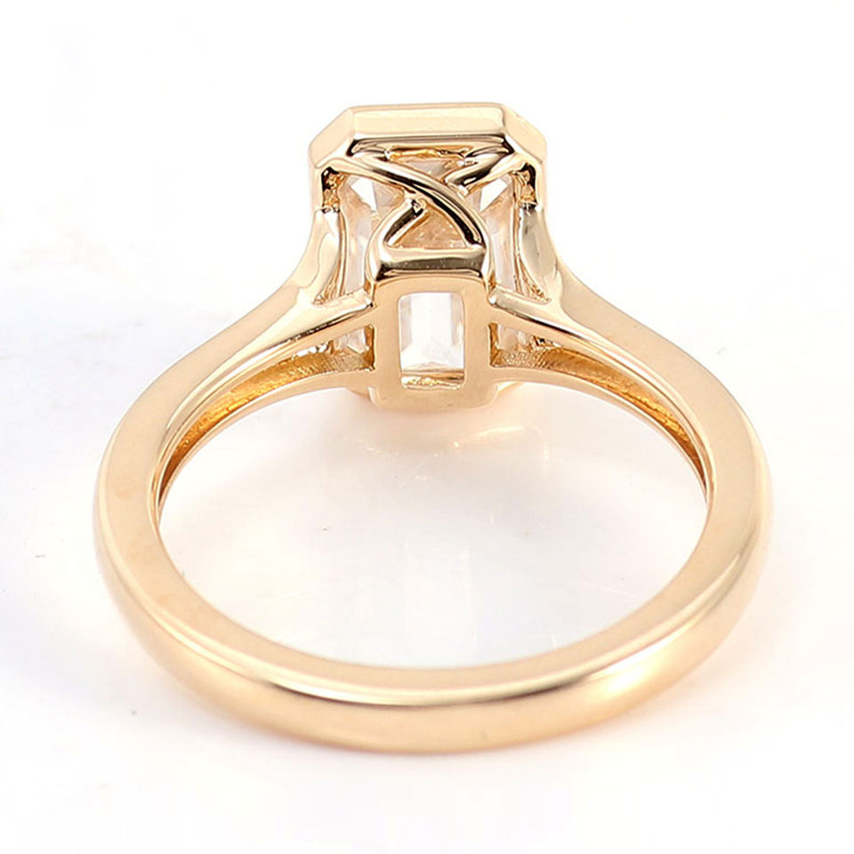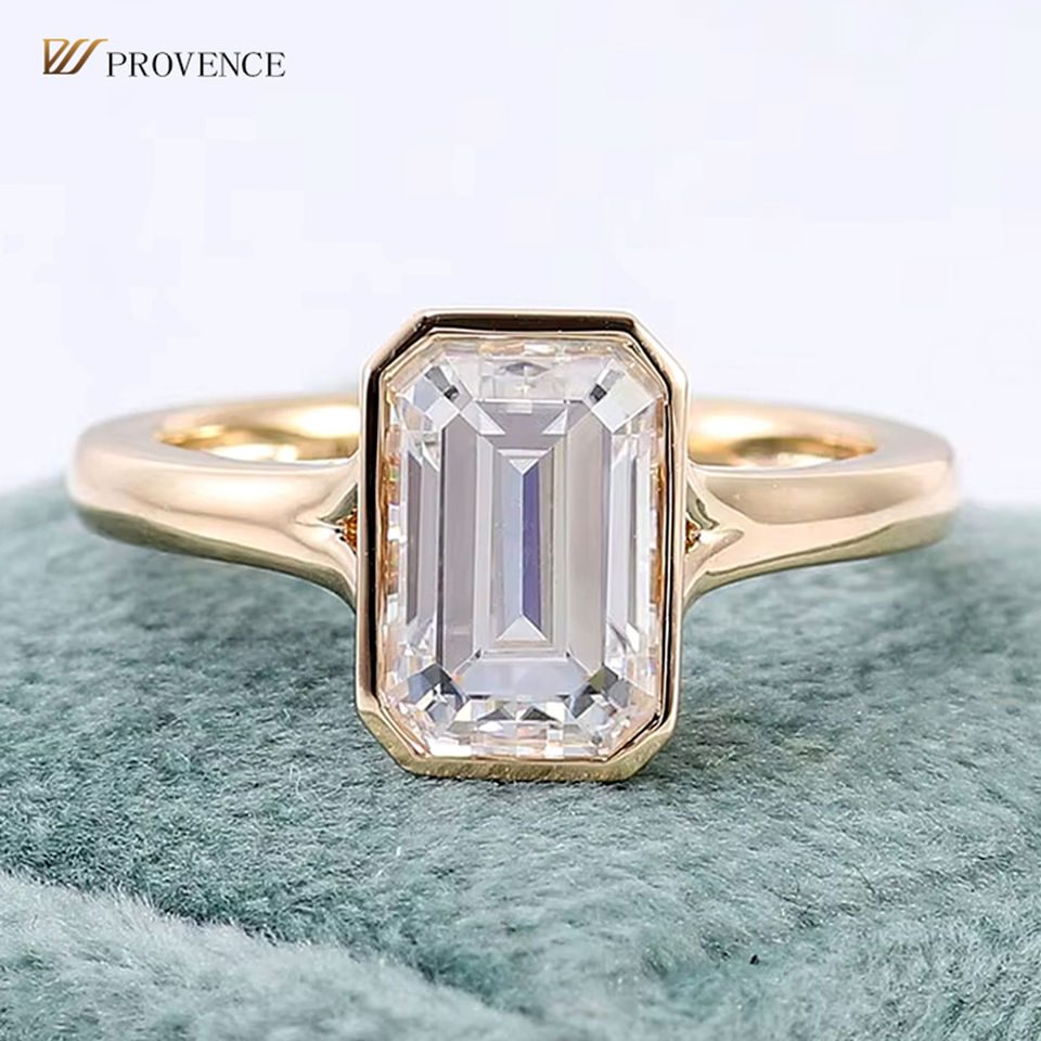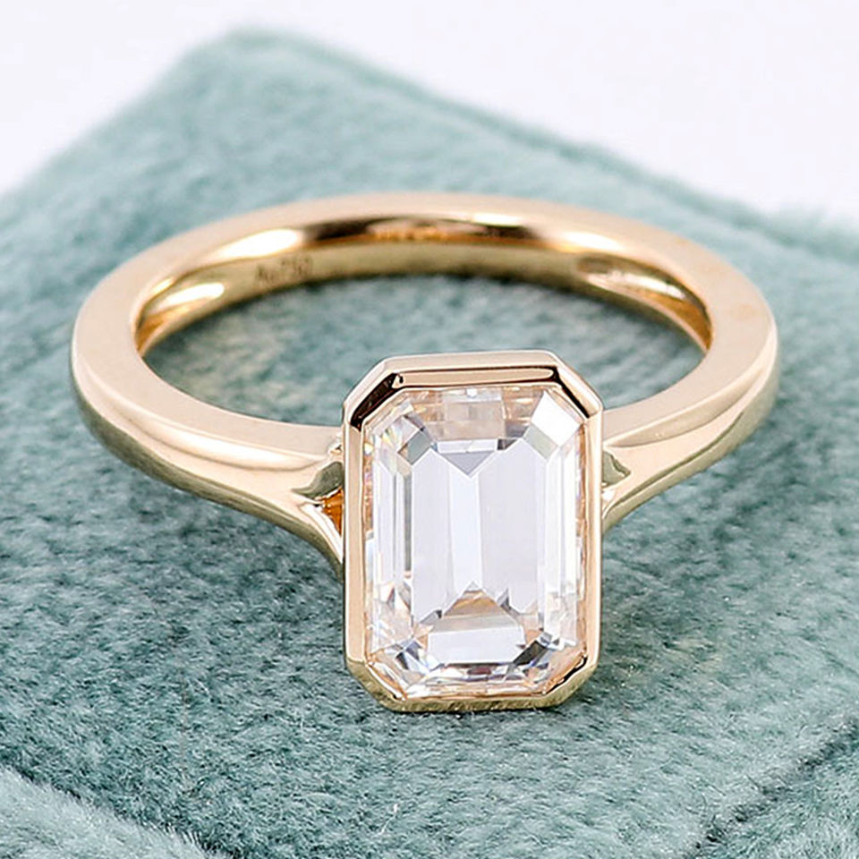 Anillo de Oro Amarillo de 18k con Engaste de Bisel, Moissanita Esmeralda de 9x6mm, 2.5 Quilates, Color DEF, Anillo Solitario de Diamante, Anillo de Compromiso Simple