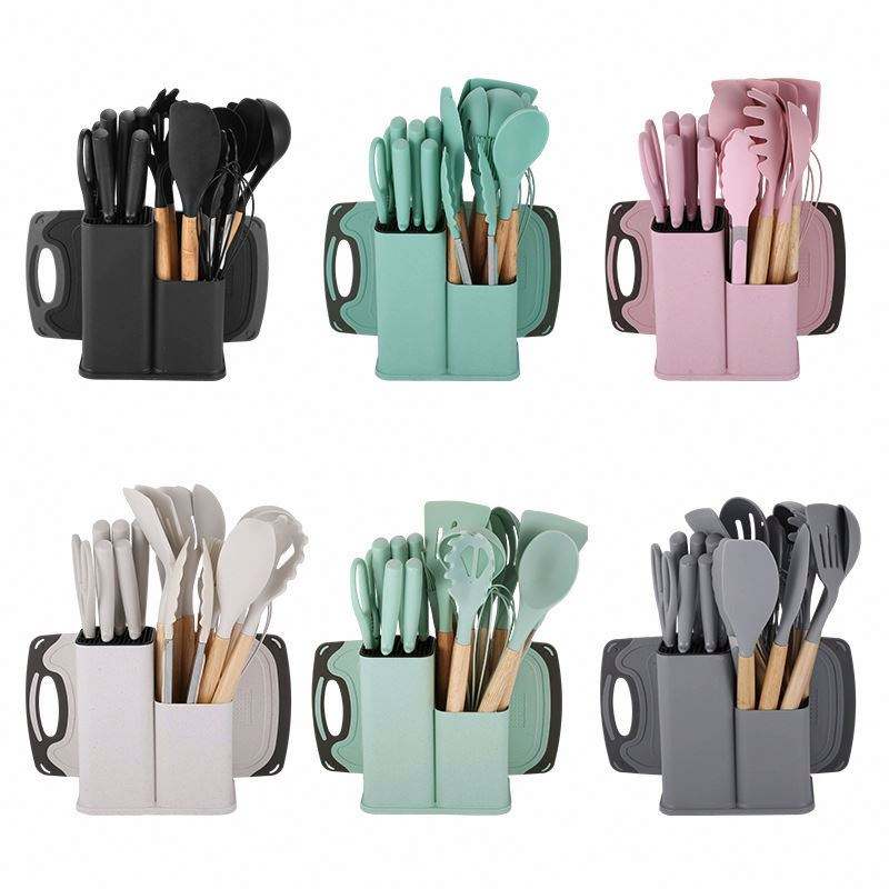 Juego de Utensilios de Cocina de Silicona de 19 Piezas con Mango de Madera, Cuchara Antiadherente, Cubo de Almacenamiento de Cuchillos Multifuncional Integrado
