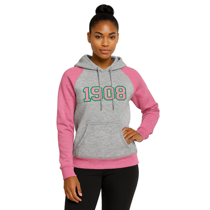 1908 Grey Body Pink Raglan Sleeves Pullover Sudadera con capucha Mezcla de algodón Hermandad de mujeres griega Ropa personalizada Divine Nine HBCU Ropa griega