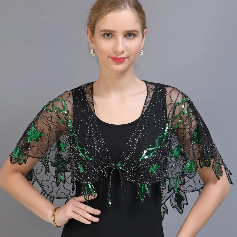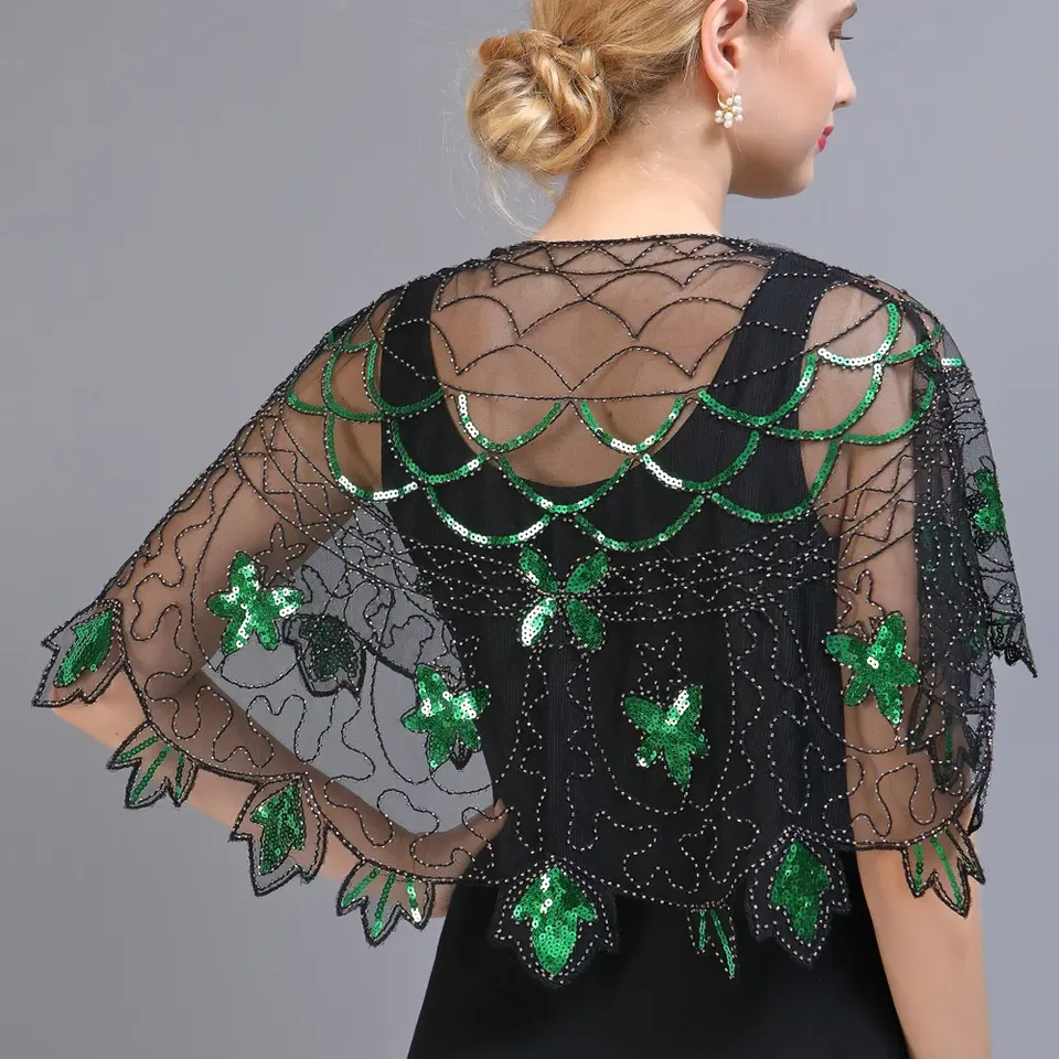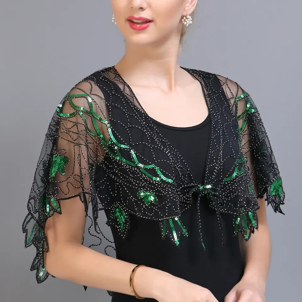 Chales de los años 20, capas de noche transparentes de malla con lentejuelas y cuentas, chales nupciales transparentes, boleros, accesorios de vestir para fiestas estilo flapper