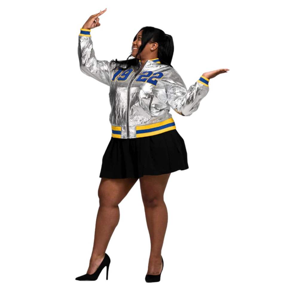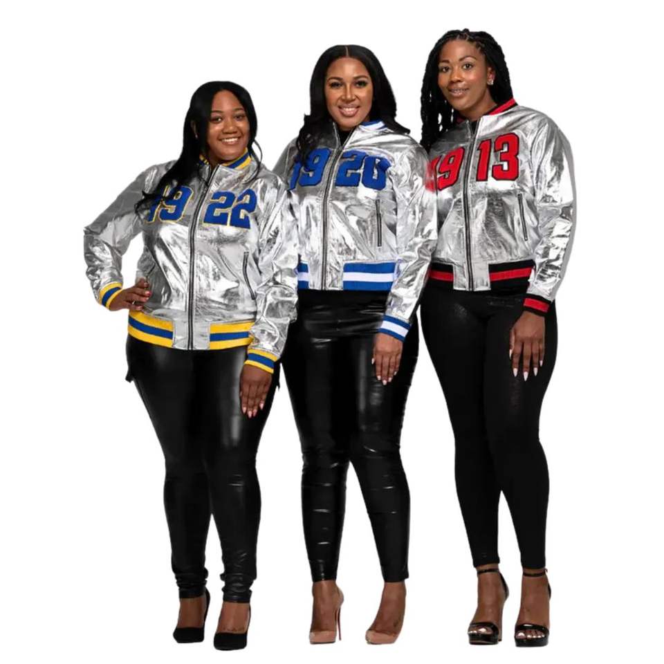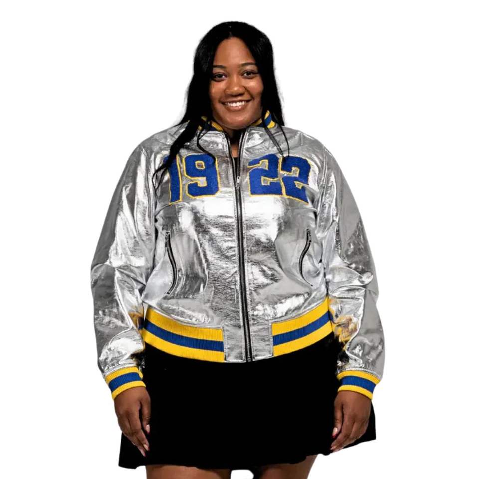 Chaqueta Bomber plateada 1922 con acabado metálico con ribete de costilla de oro azul bordado 1922 parche Premium Sigma Gamma Rho Sorority Wear