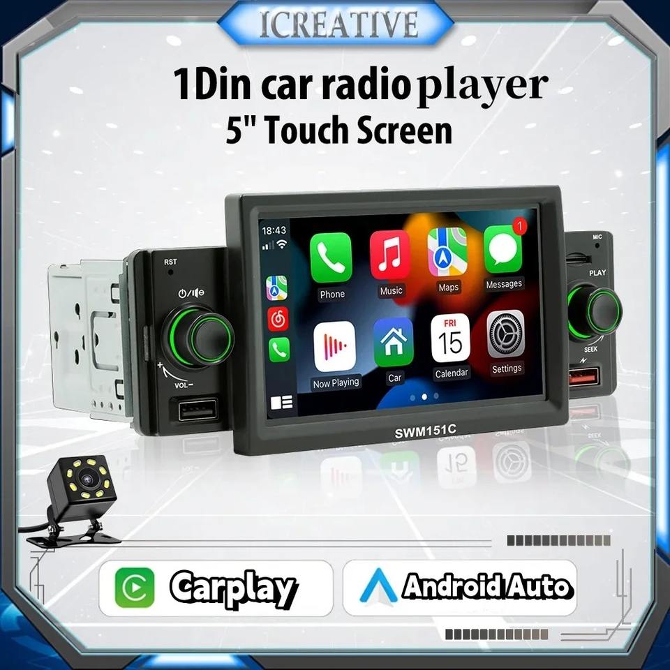 Radio de coche 1Din Multimedia Carplay y Android Auto Player Mirrorlink pantalla navegación 5 ''pantalla táctil Autoaudio FM cámara trasera entrada