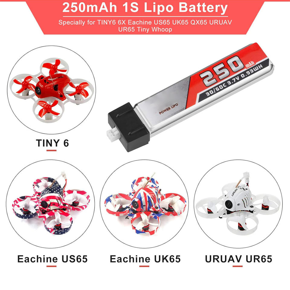 Batería LiPo 1S, 4 Piezas, 3.7V, 250mAh, 30C, Conector Micro JST 1.25 para Dron de Carreras FPV, Hecho en China