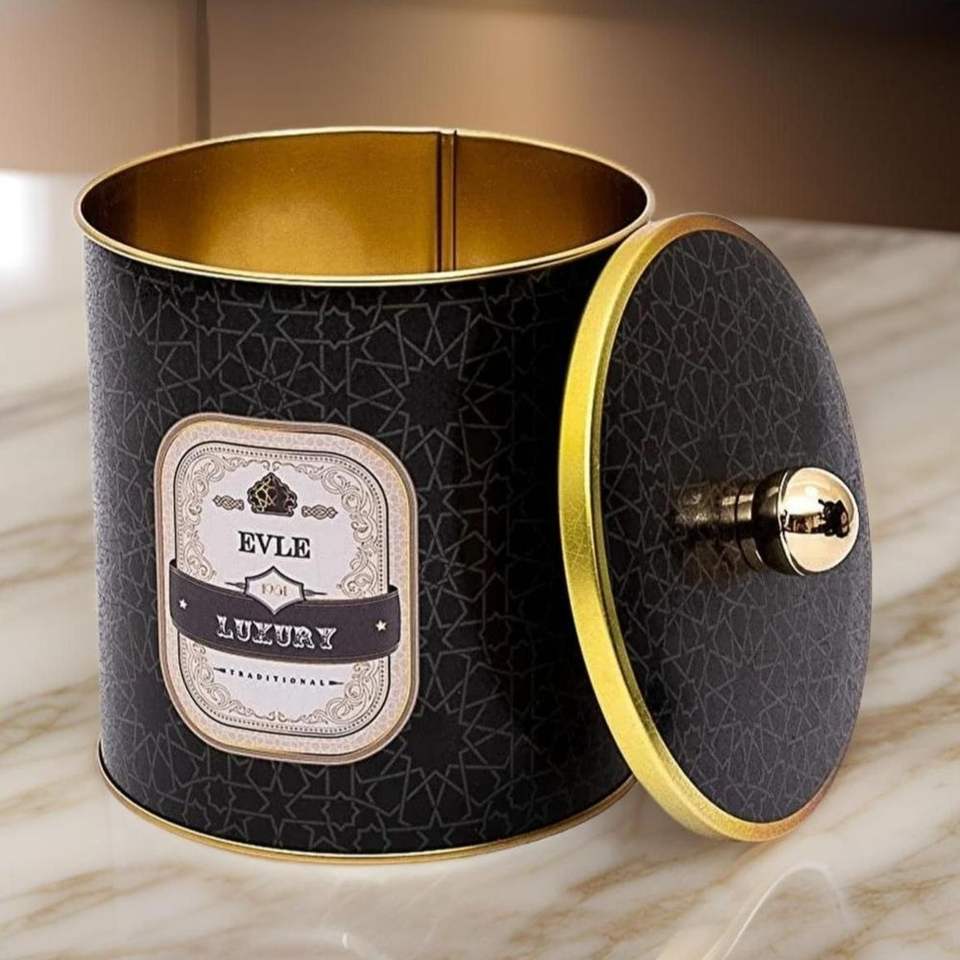 Recipiente redondo de metal con patrón geométrico dorado de 2.1L con mango de perilla de 140x150mm fondo negro