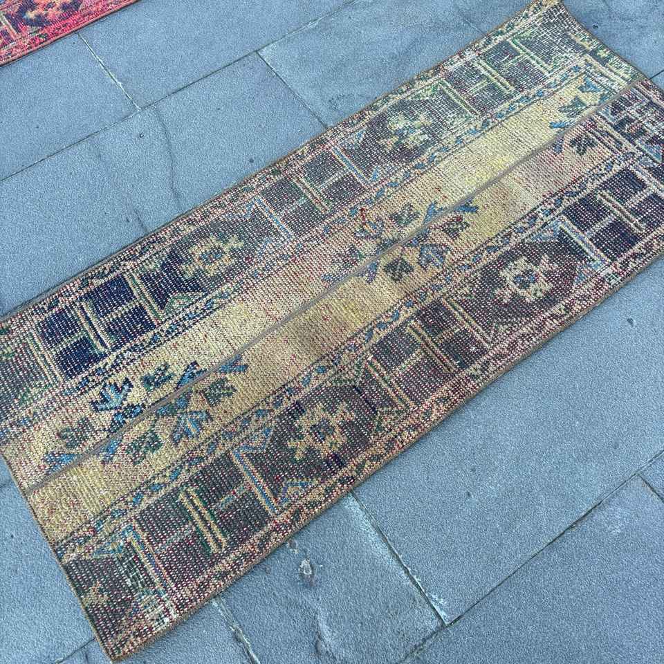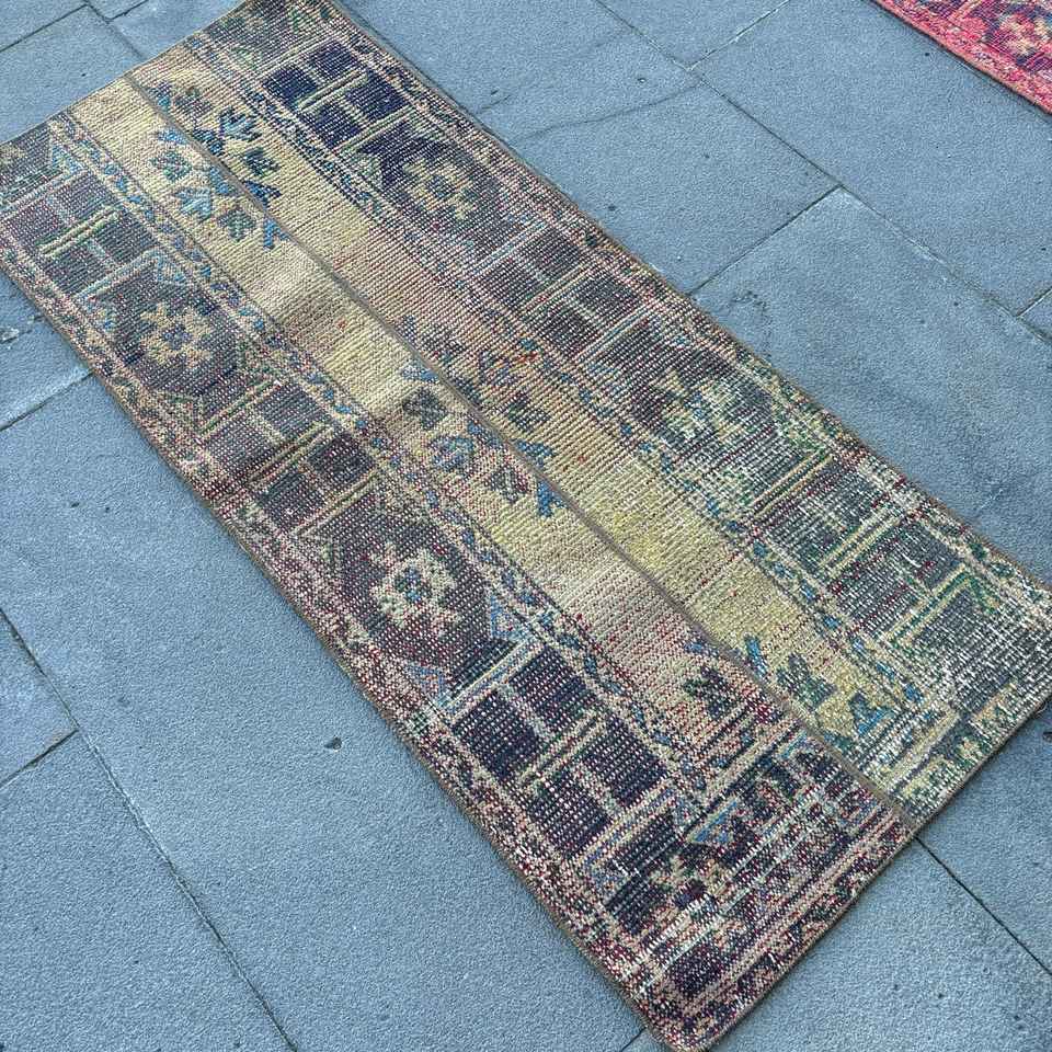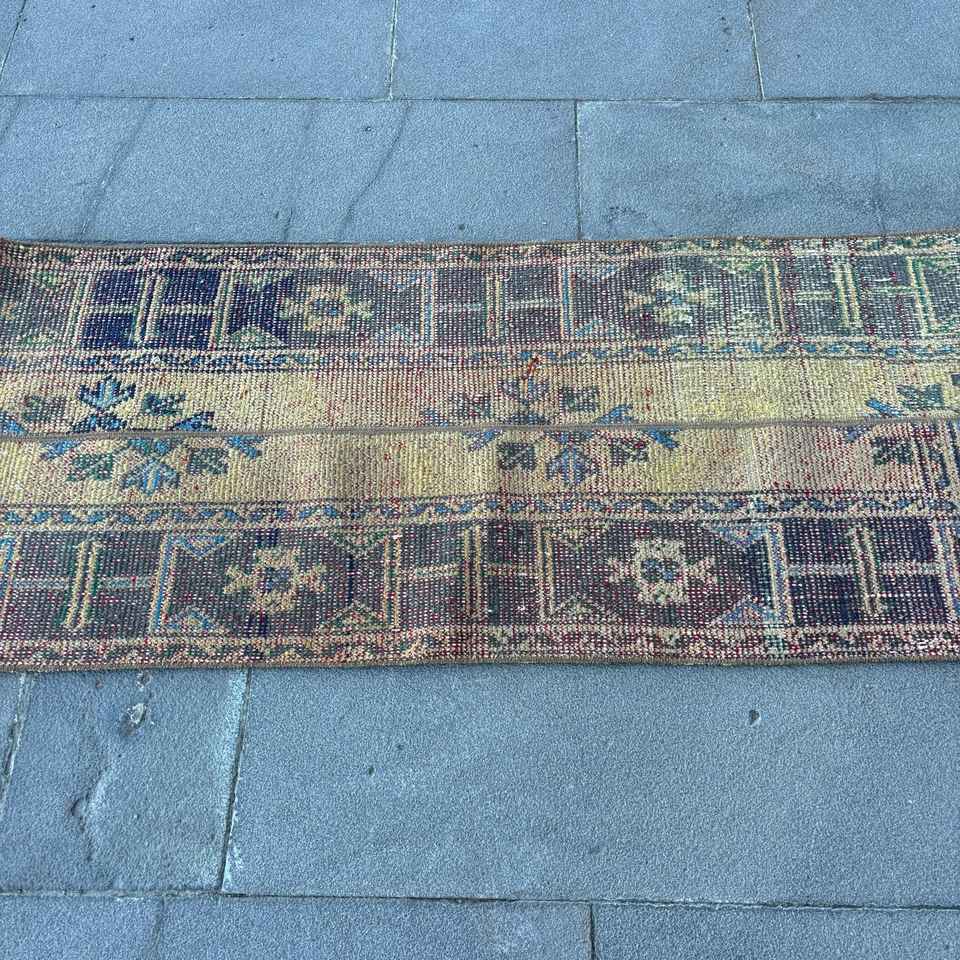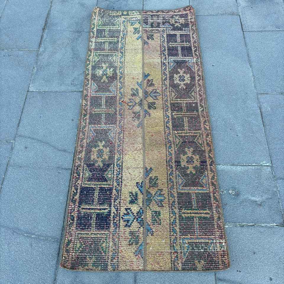 Alfombra Turca Vintage de Lana de 2.1x5 pies, Diseño Floral con Parches Azules, Ecológica con Base de Látex