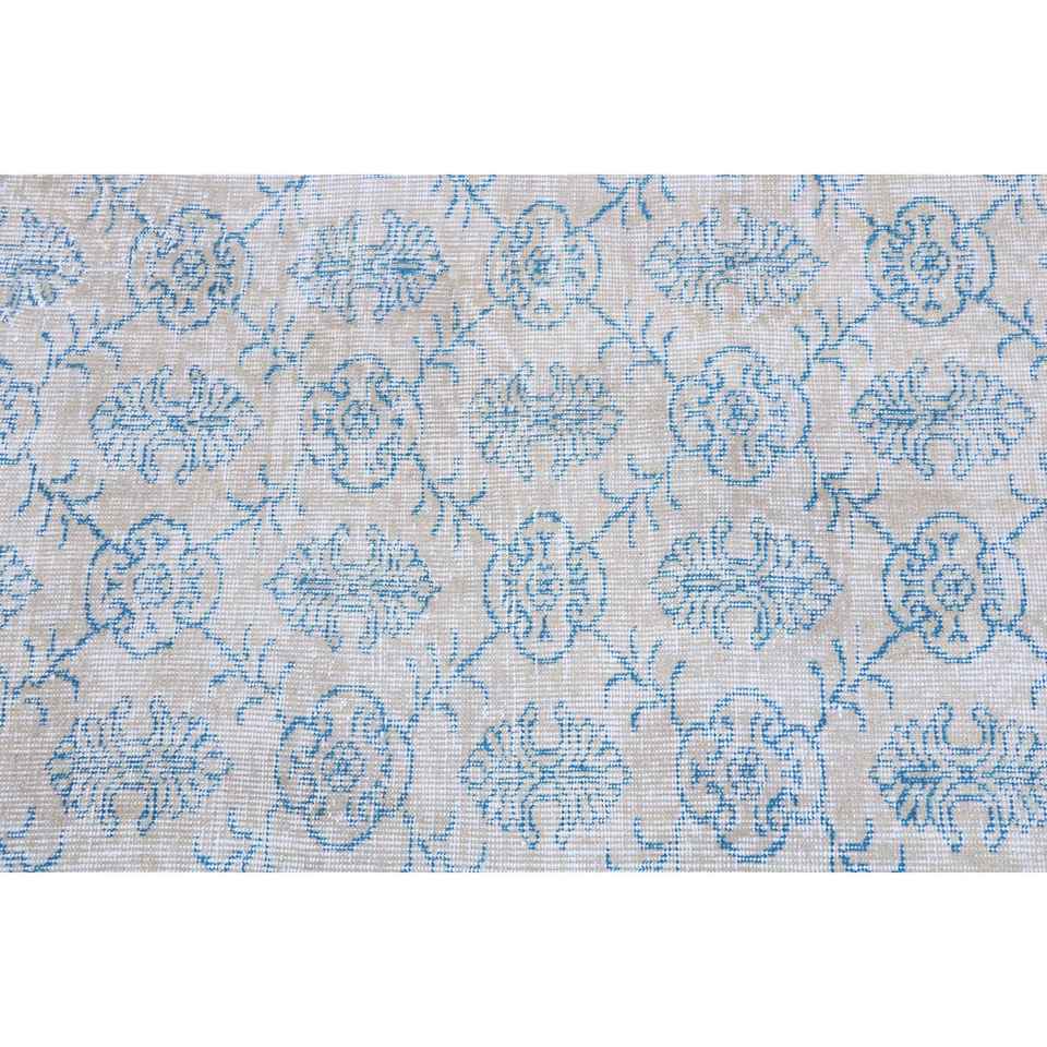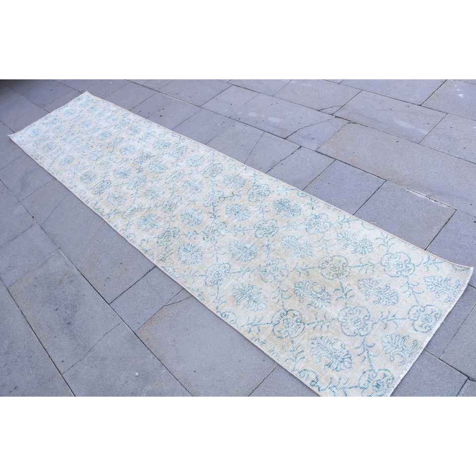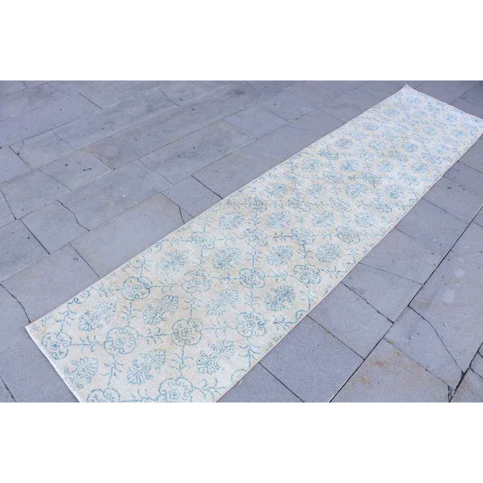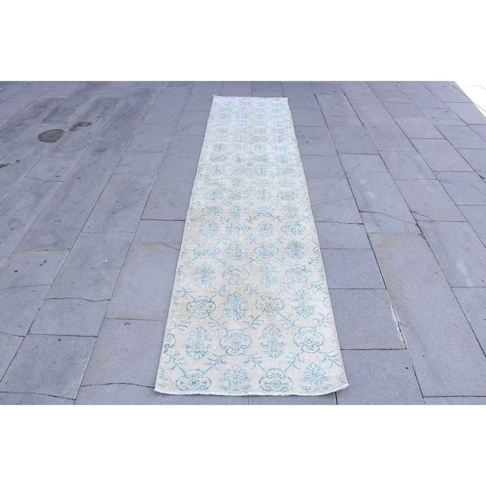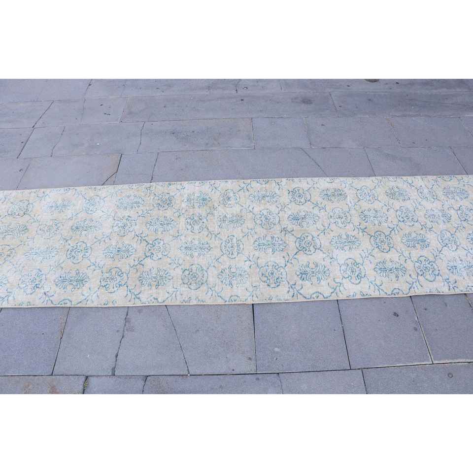 Alfombra Vintage de 2.2x9.6 pies, Alfombra Turca, Alfombra Ikat Azul y Blanca