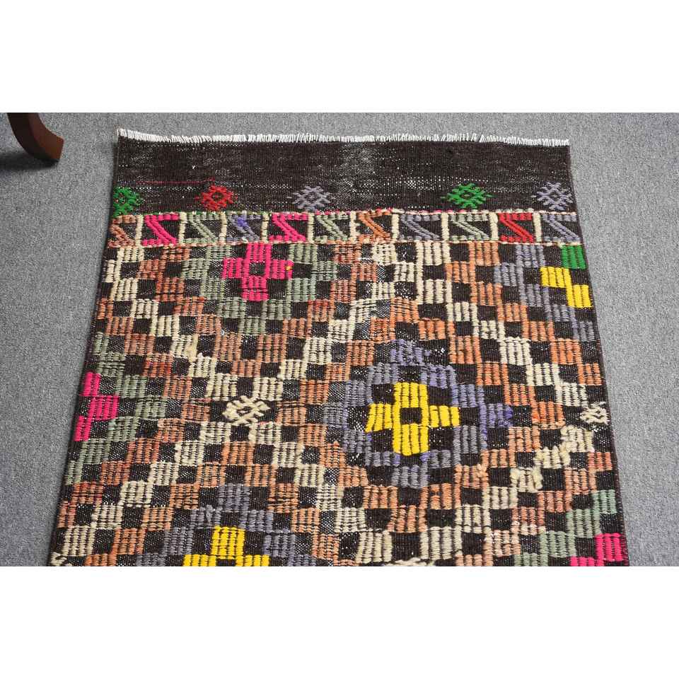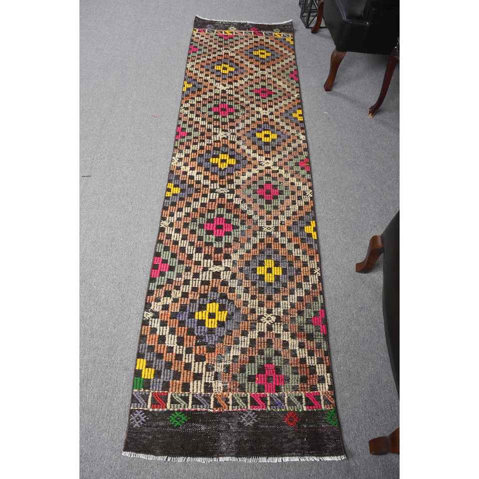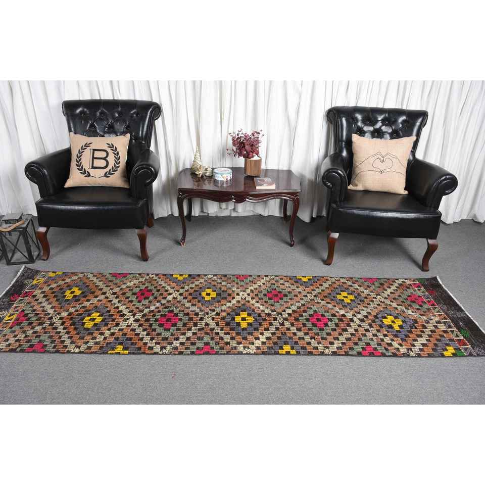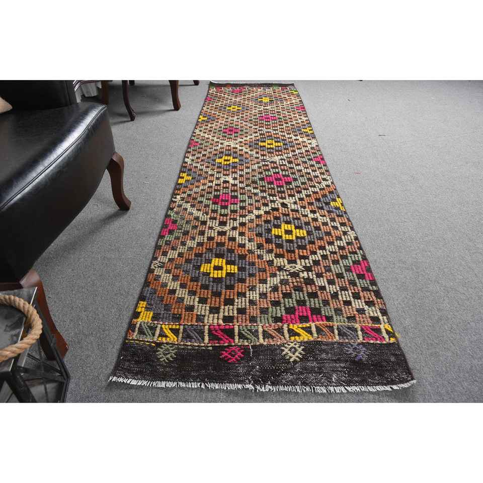 Alfombra turca Kilim de 2.4x9 pies, alfombra vintage, alfombra de lana con diseño de plantas y árboles marrones