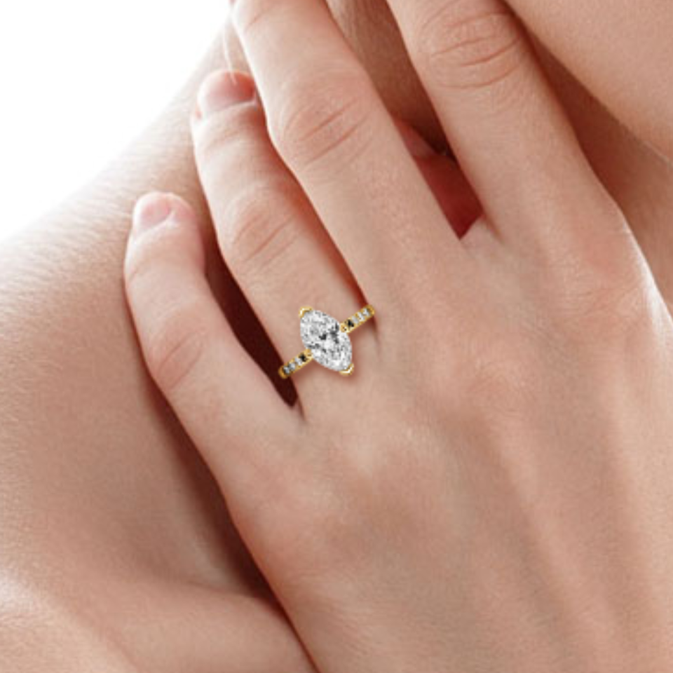 Anillo de compromiso de diamante cultivado en laboratorio de corte Marquesa de 2,5 quilates con acento en oro amarillo de 14 quilates F Color VVS2 Claridad