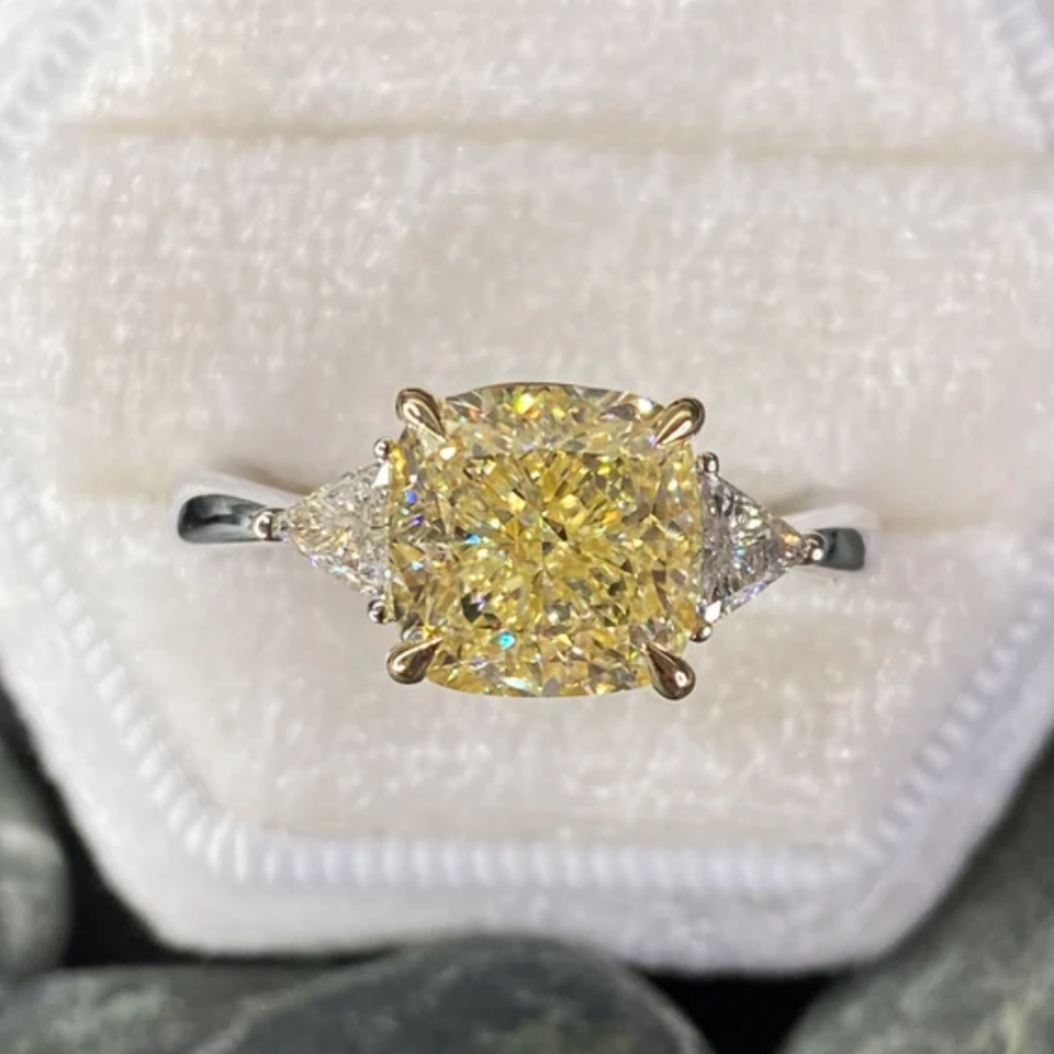 Anillo de compromiso de diamante cultivado en laboratorio con forma de cojín de Color amarillo elegante de 2,5 quilates, anillo de diamante de 3 piedras certificado IGI de oro de 14K