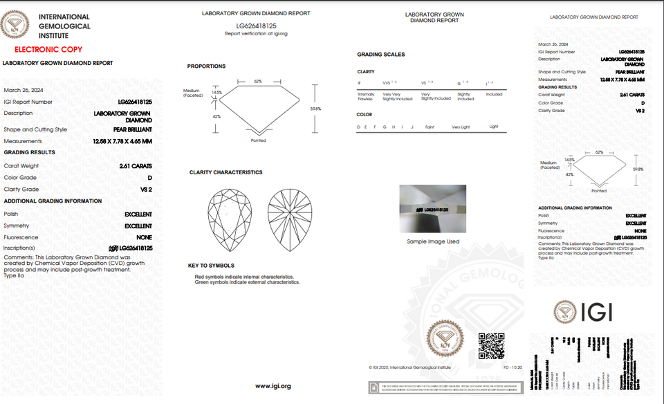 2,61 CT Corte de pera Diamante cultivado en laboratorio IGI Certificado D Color VS2 Clarity Lab-Stone