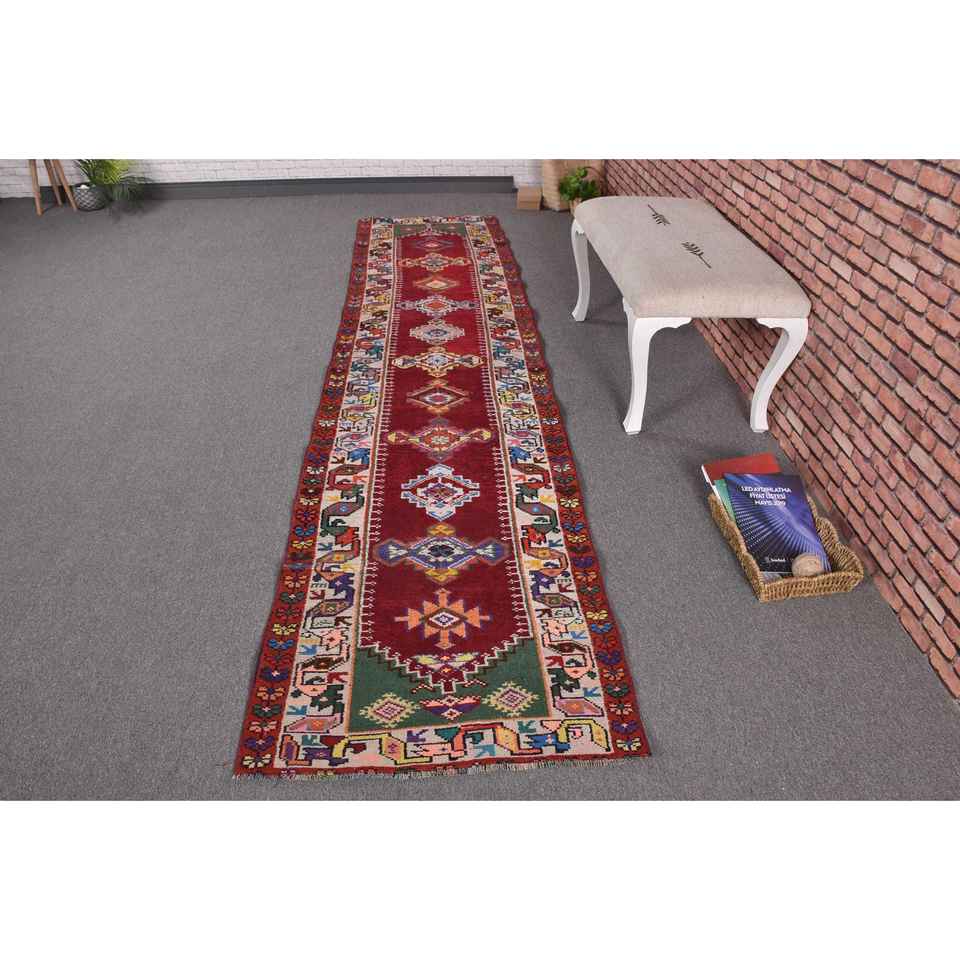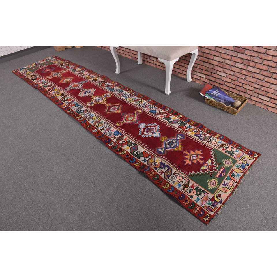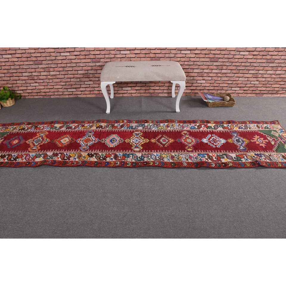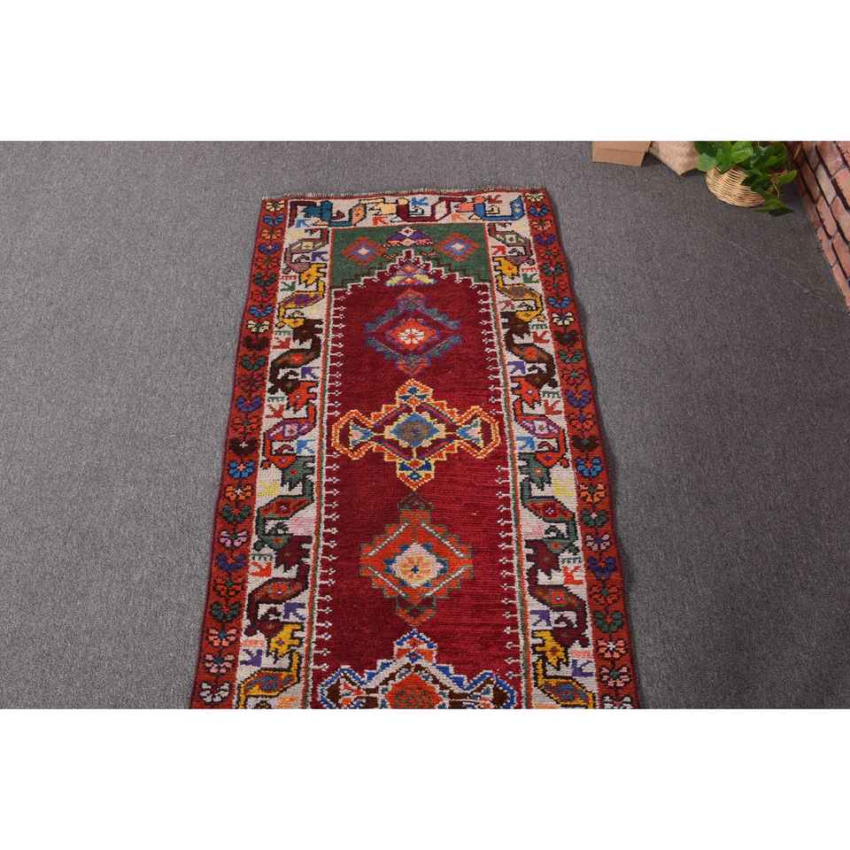 Alfombra de 2.6x10.7 pies, Alfombra Turca Herki, Alfombra Floral de Lana Roja Vintage