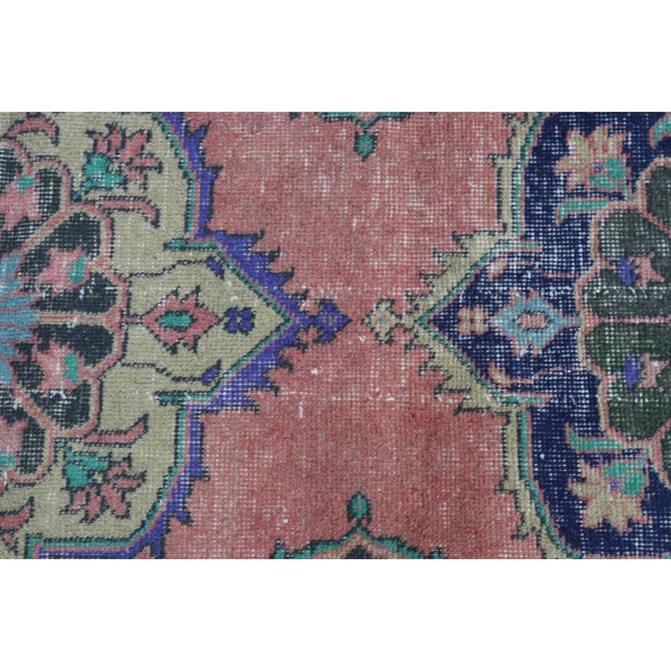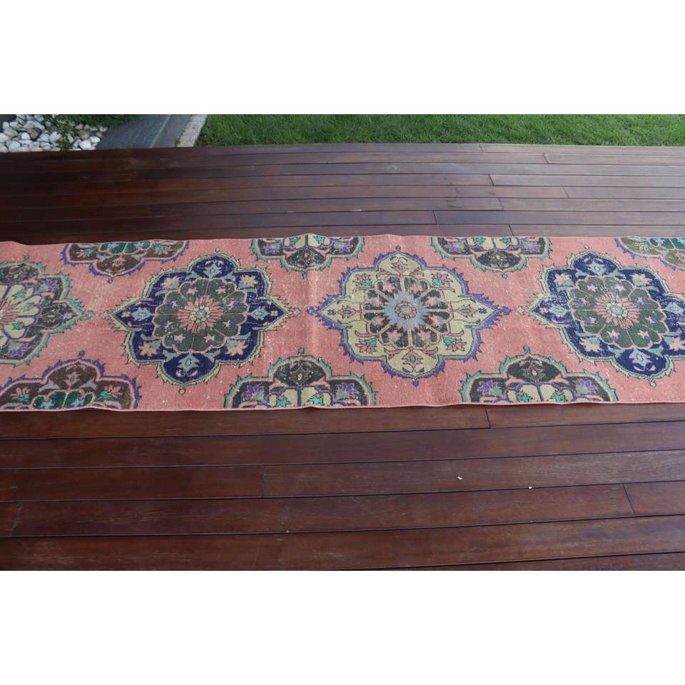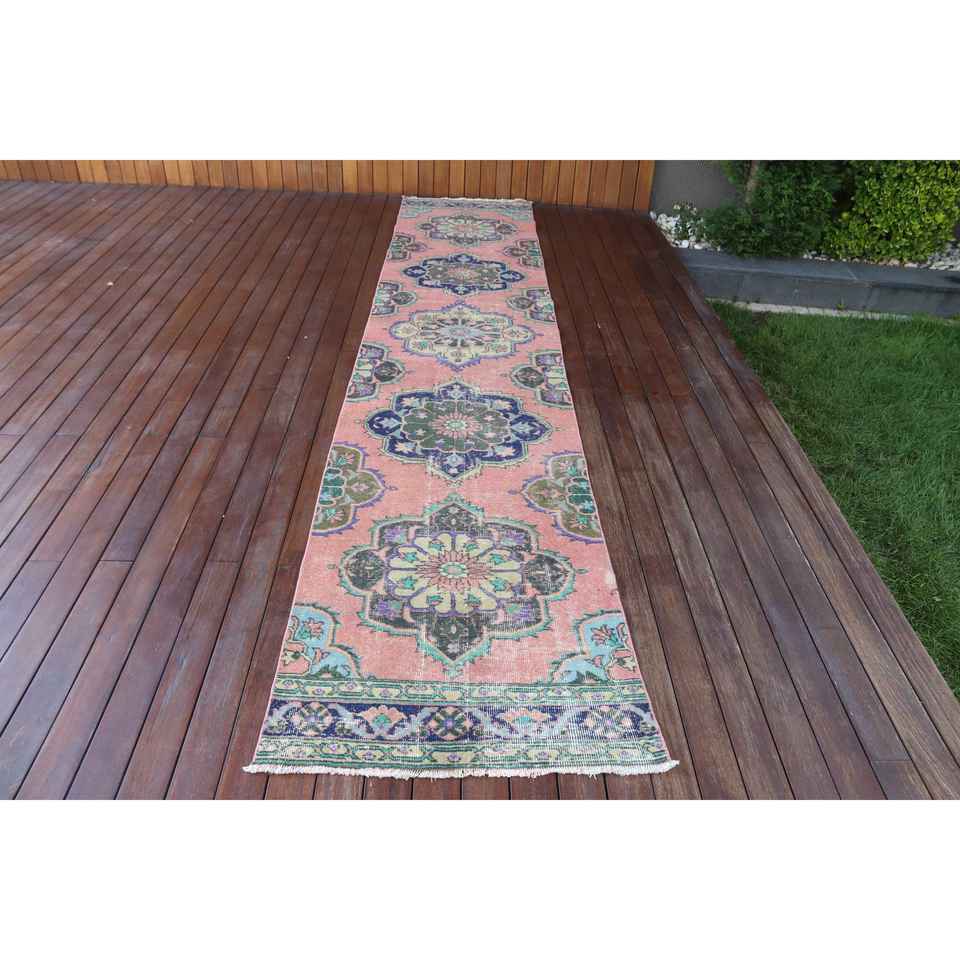 Alfombra Turca de 2,6x12,8 pies, Alfombra Vintage Tipo Runner, Alfombra de Lana con Camuflaje Rosa y Azul