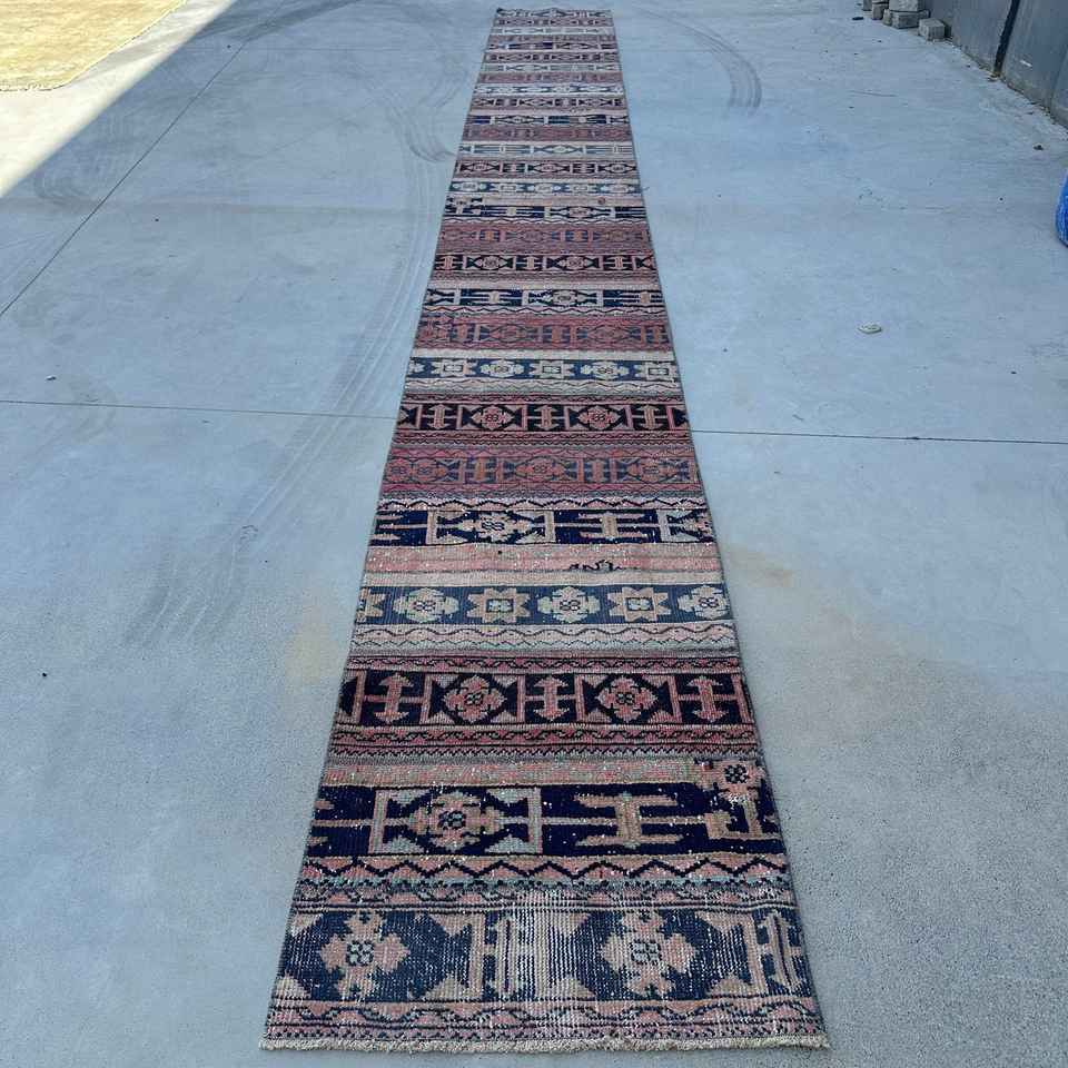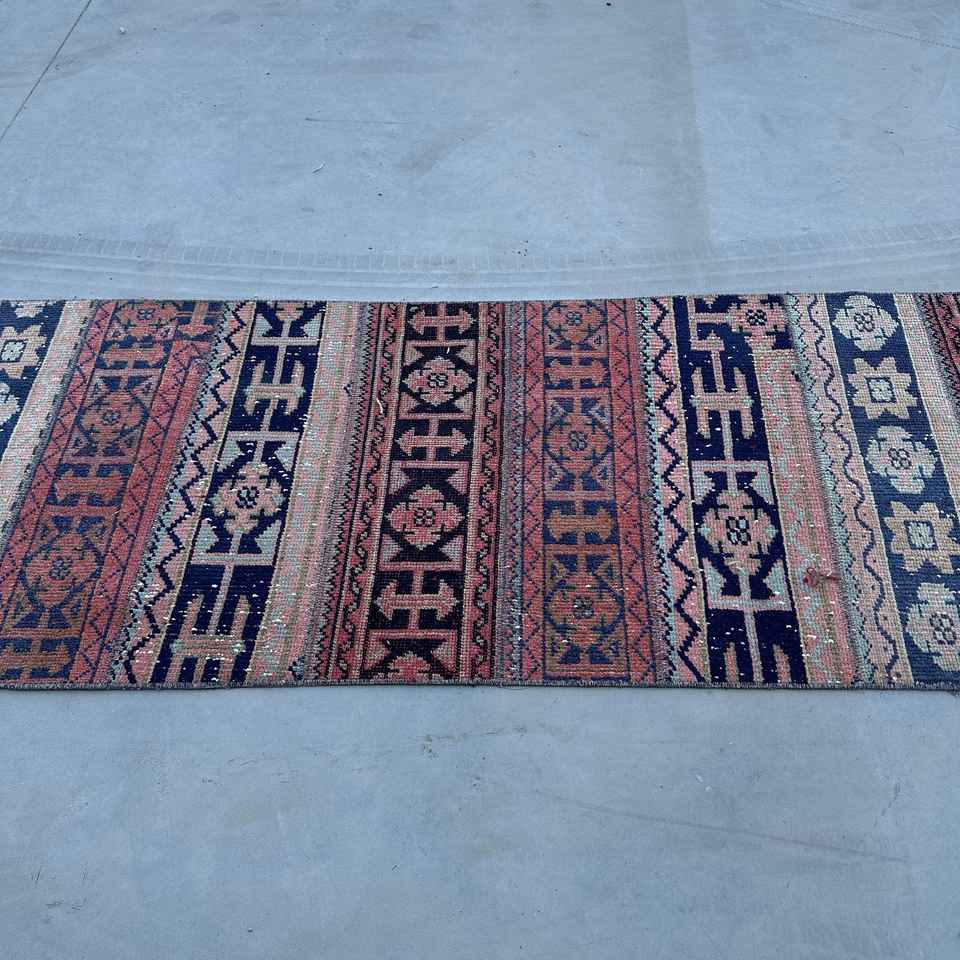 Alfombra Vintage de 2.6x23.5 pies, Alfombra Turca, Alfombra Floral Azul y Roja