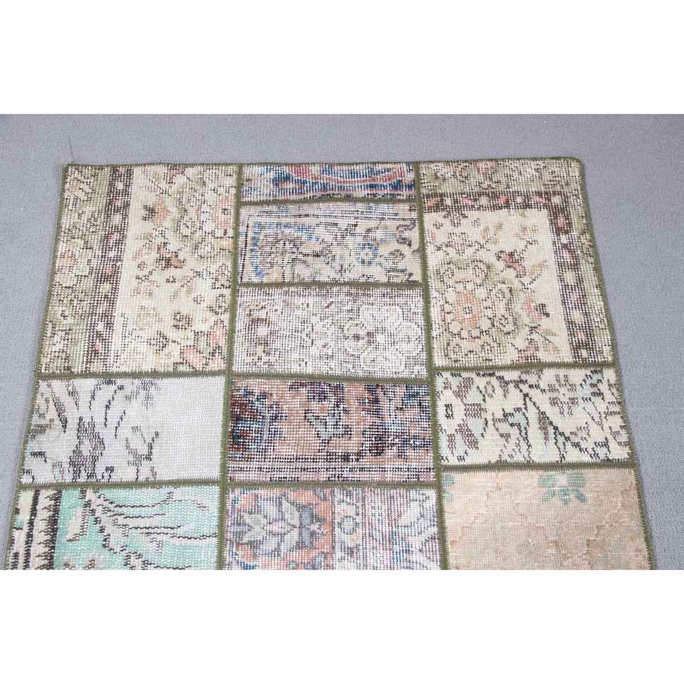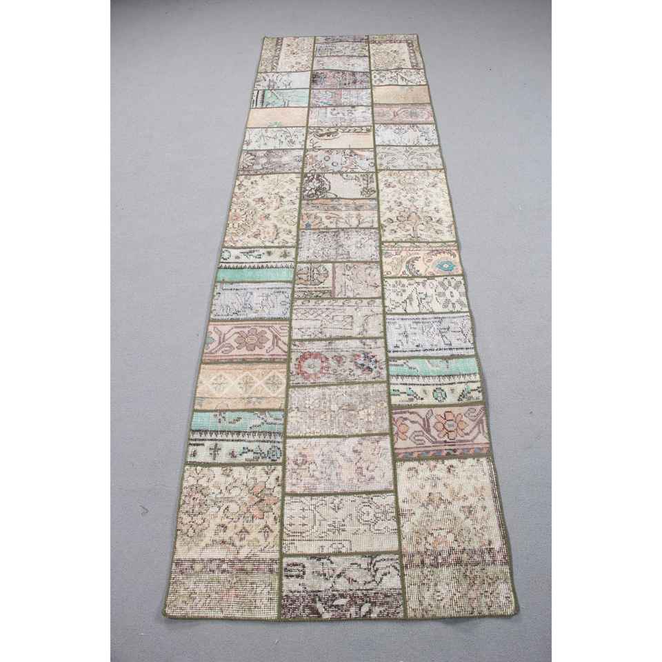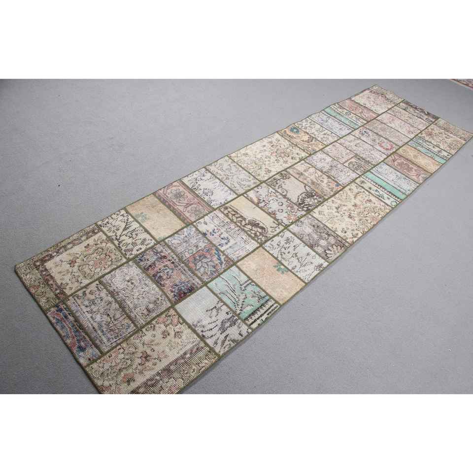 Alfombra Turca Vintage Ecológica de Lana de 26x8,8 pies, con Diseño de Parches Marrones y Base de Látex