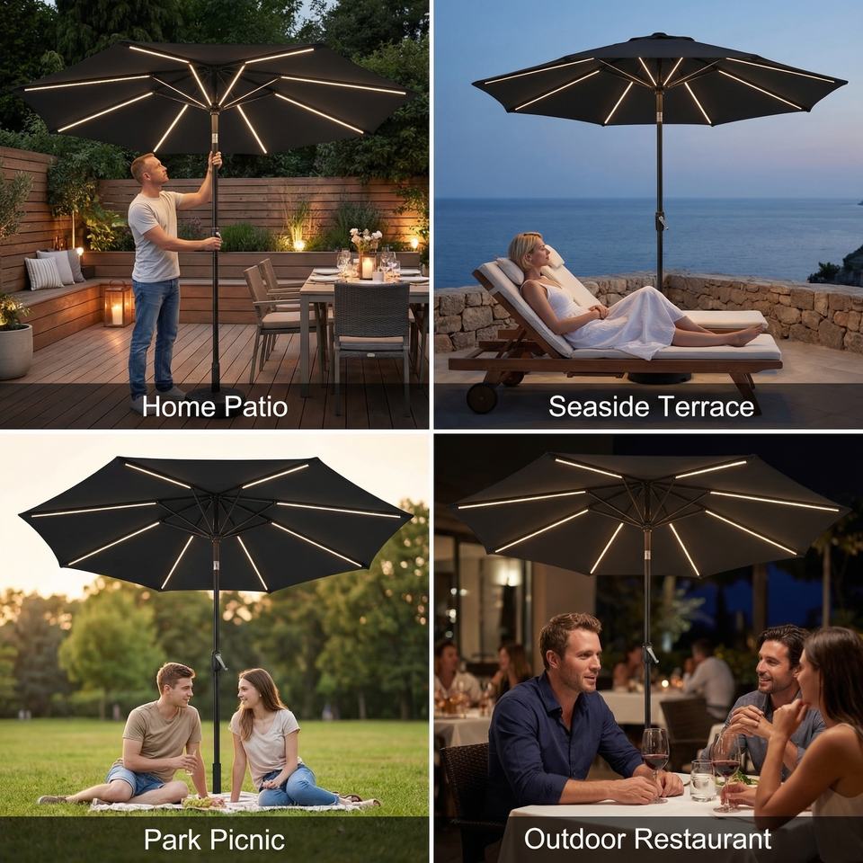 Sombrilla Redonda LED Solar Moderna de 2.7m, Impermeable, con Barras de Luz, Poste Central y Manivela de Inclinación, para Cafetería, Jardín, Exteriores