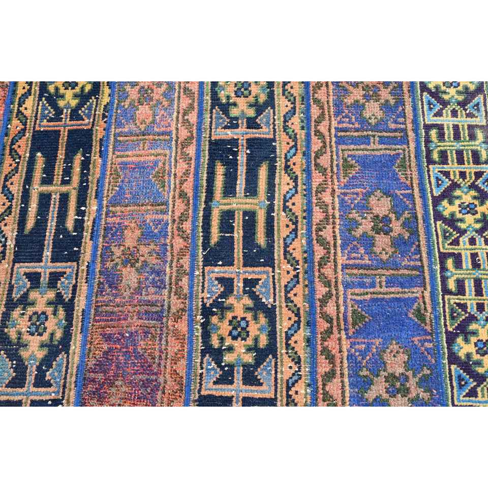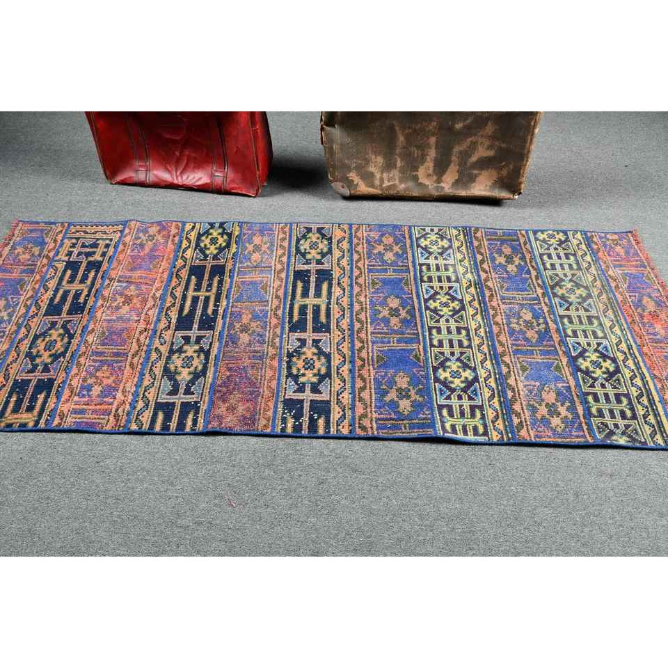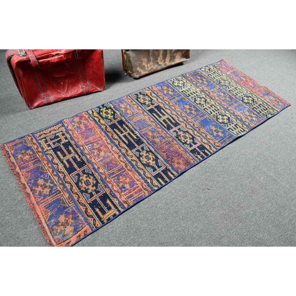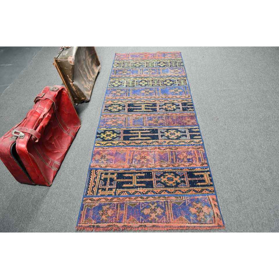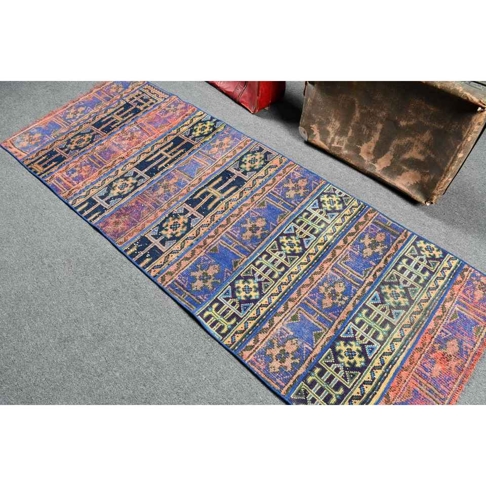 Alfombra de 2.8x7.3 pies, Alfombra Turca Vintage, Alfombra de Lana Azul con Diseño de Patchwork