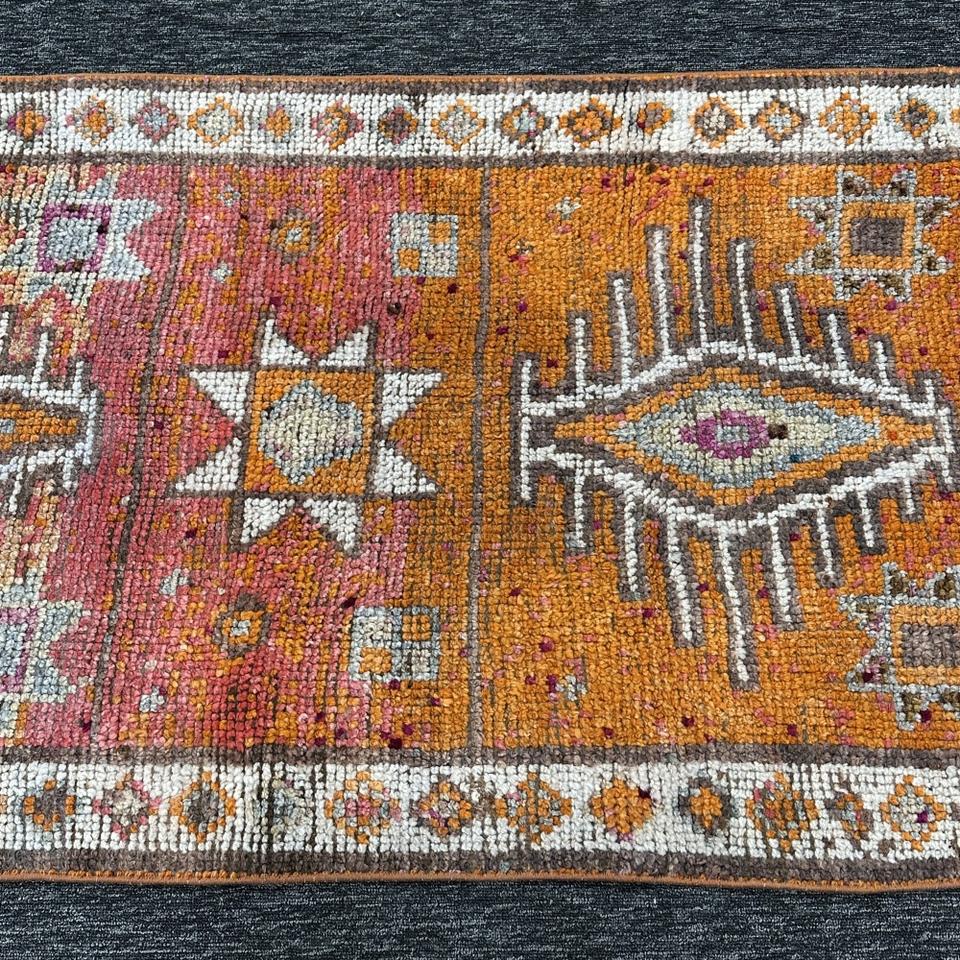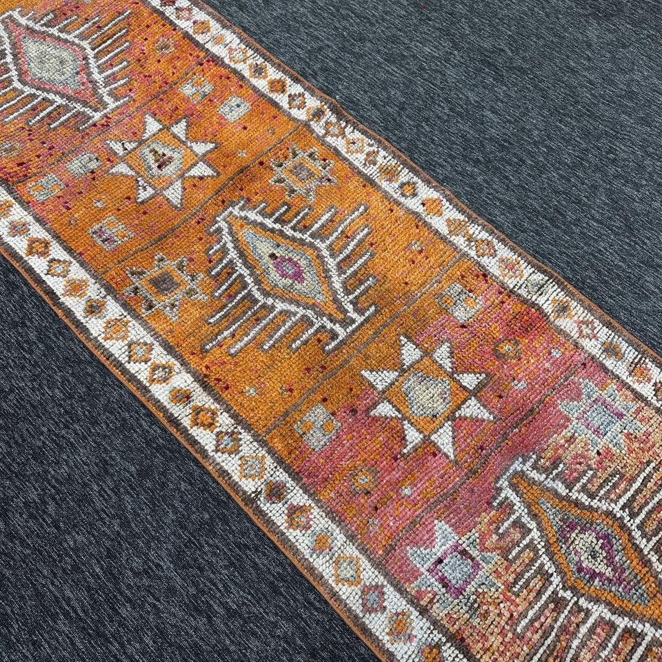 Alfombra Vintage de 2.8x9.7 pies, Alfombra Turca Pequeña, Alfombra Geométrica Naranja