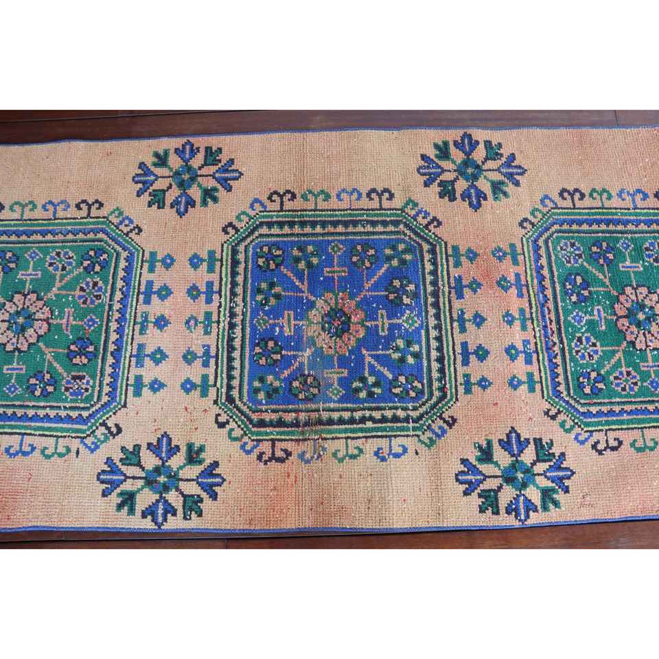 Alfombra de 2.9x10.7 pies, Alfombra Turca Vintage, Alfombra de Lana Azul Sólida