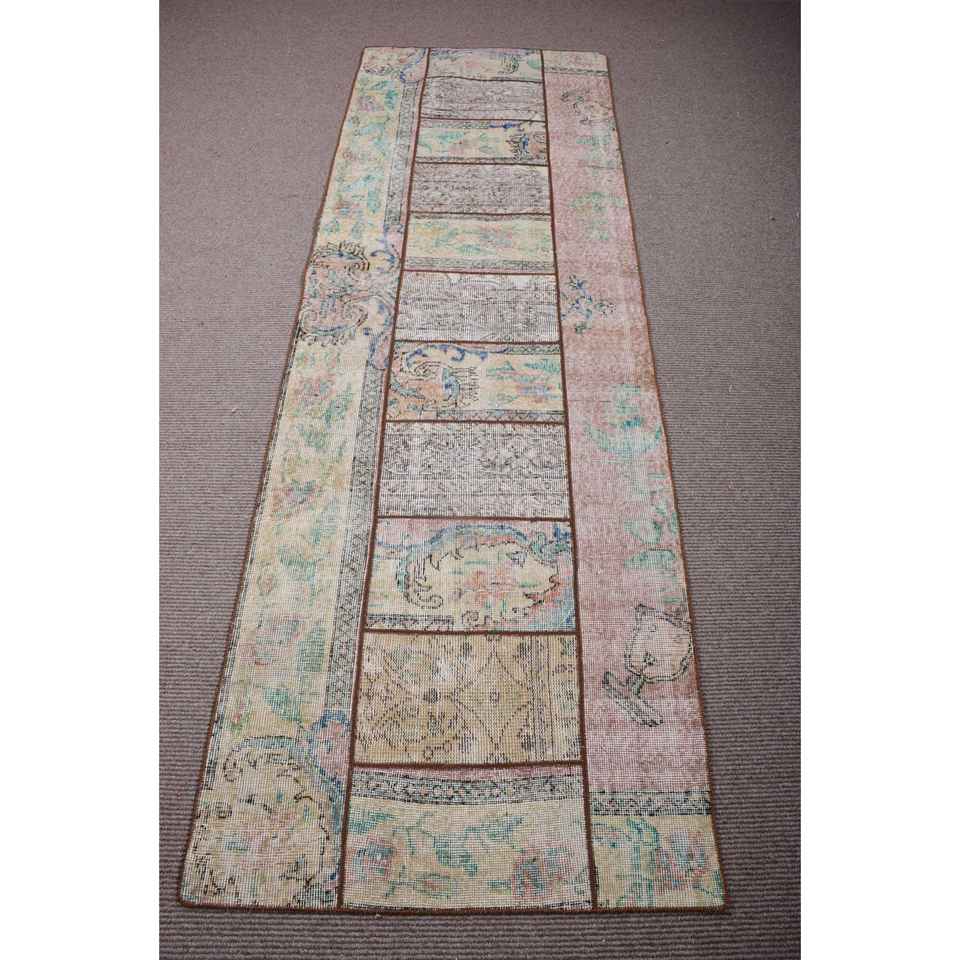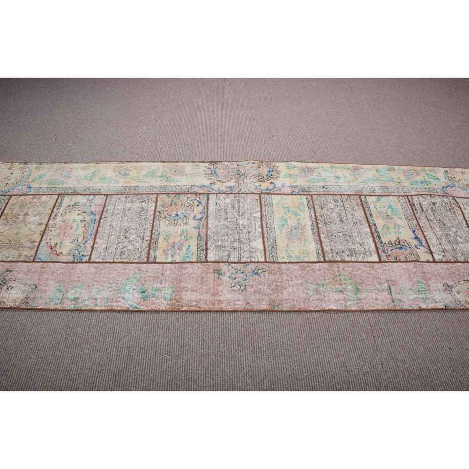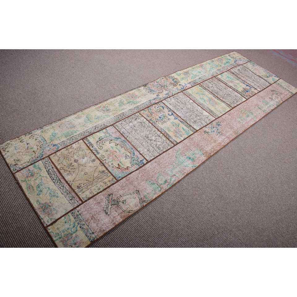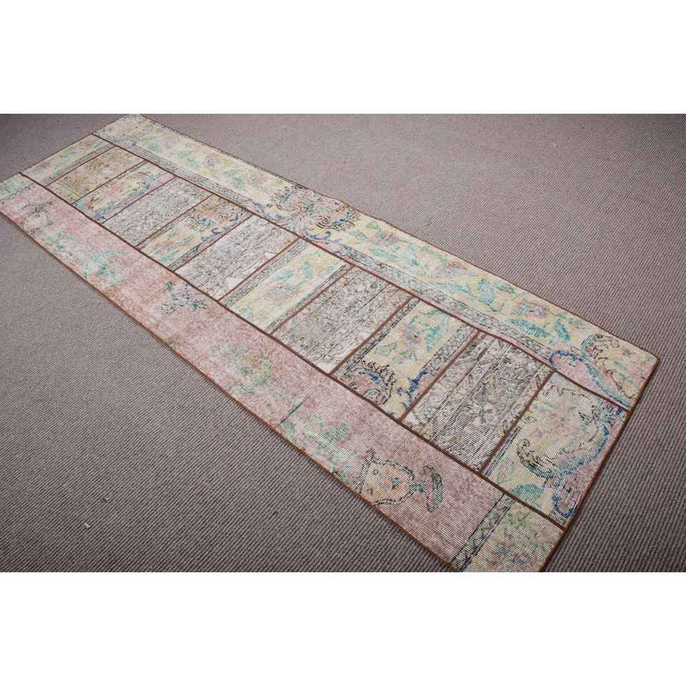 Alfombra vintage de 2,9x8,8 pies, alfombra turca tipo runner, alfombra con motivos de plantas y árboles en tonos marrón y azul.