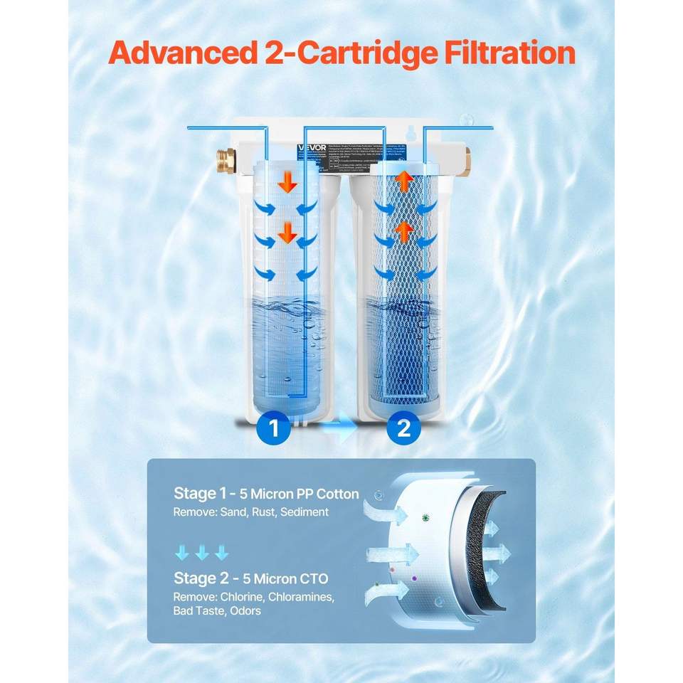 Sistema de Filtración de Agua para Autocaravanas de 2 Cartuchos, Filtro de Agua para Campistas al Aire Libre para Eliminar Sedimentos, Cloro, Malos Sabores, Olores y Mosquitos