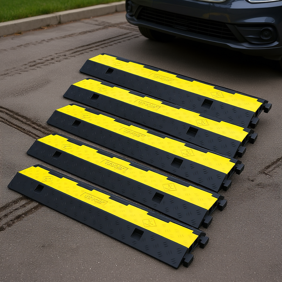 Protector de Cables Vevor de 2 Canales, Rampa Modular de Goma, Paquete de 5, Capacidad de Carga de 11000 Libras, Rampa de Tráfico para Entrada de Vehículos