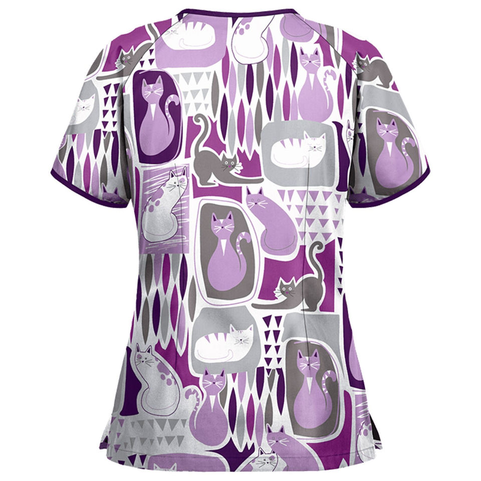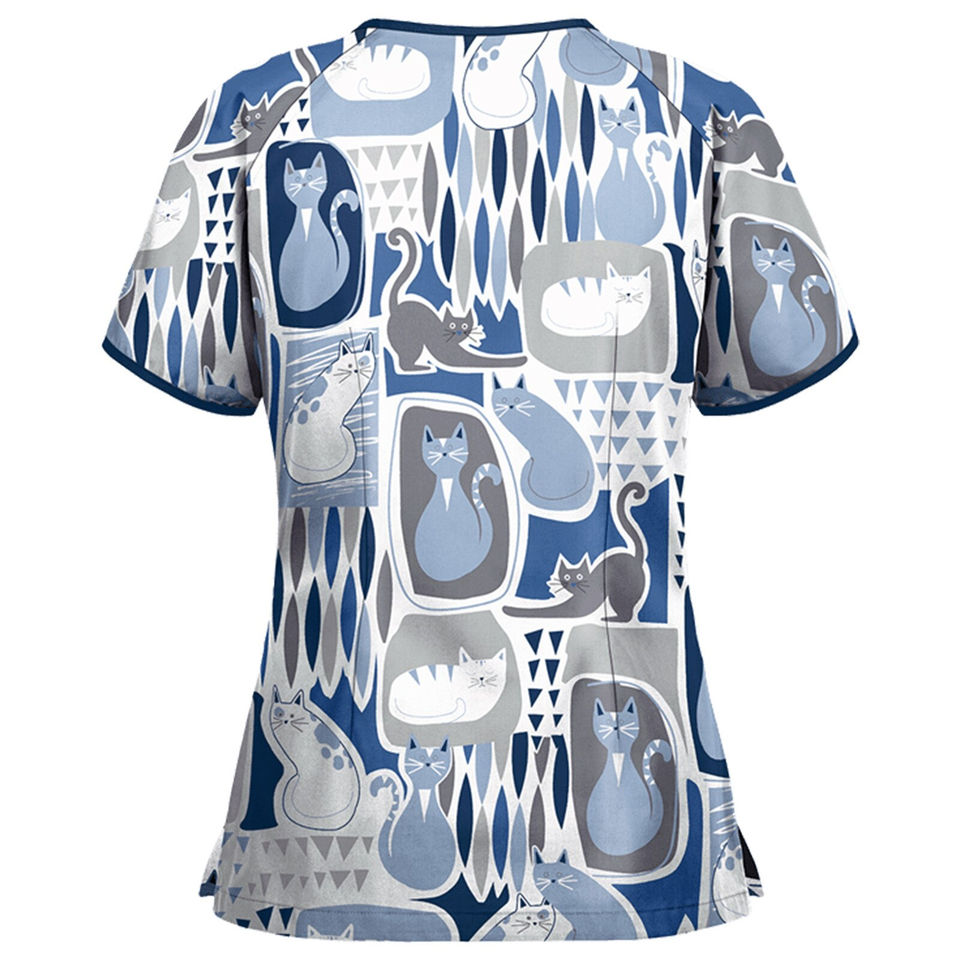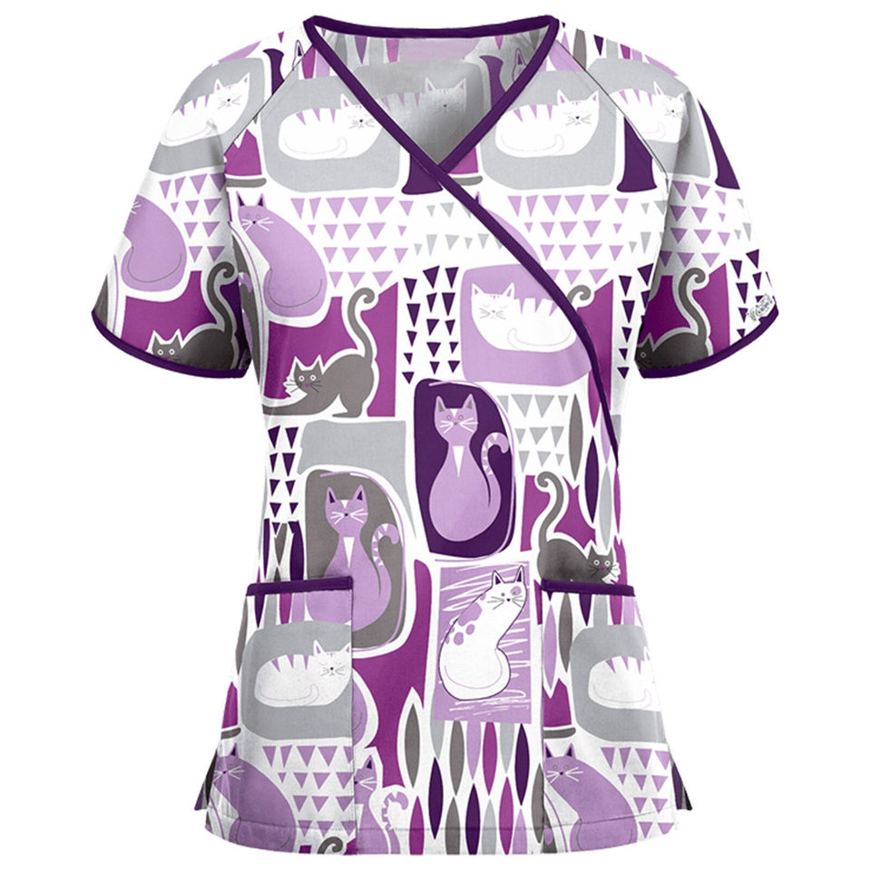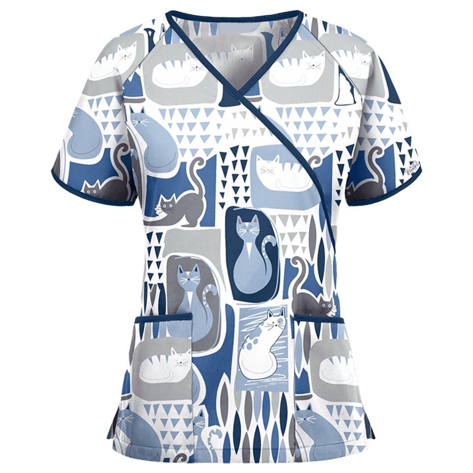 2 colores 6 gato dibujos animados impreso cuello en V camiseta Tops XL enfermería Scrubs bolsillos principales Hospital cuidado laboratorio bata diseño OEM uniformes