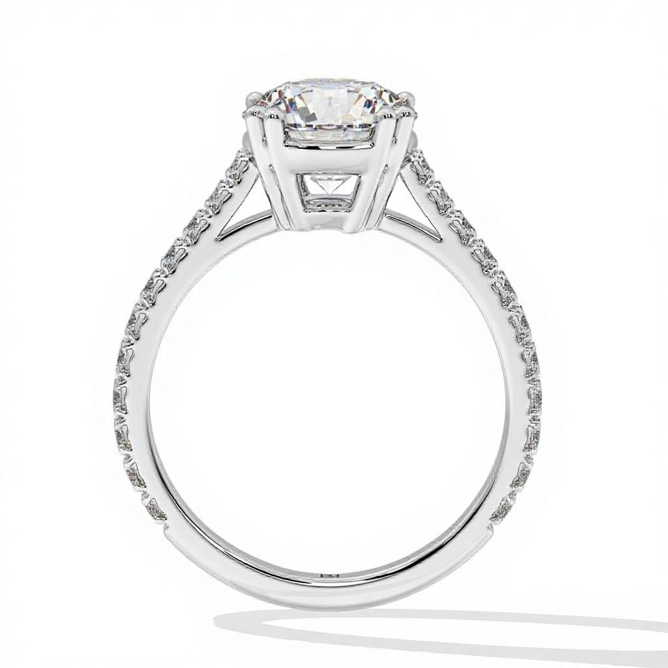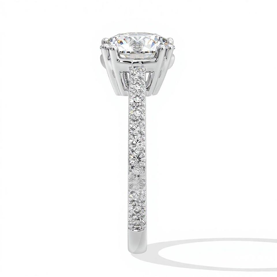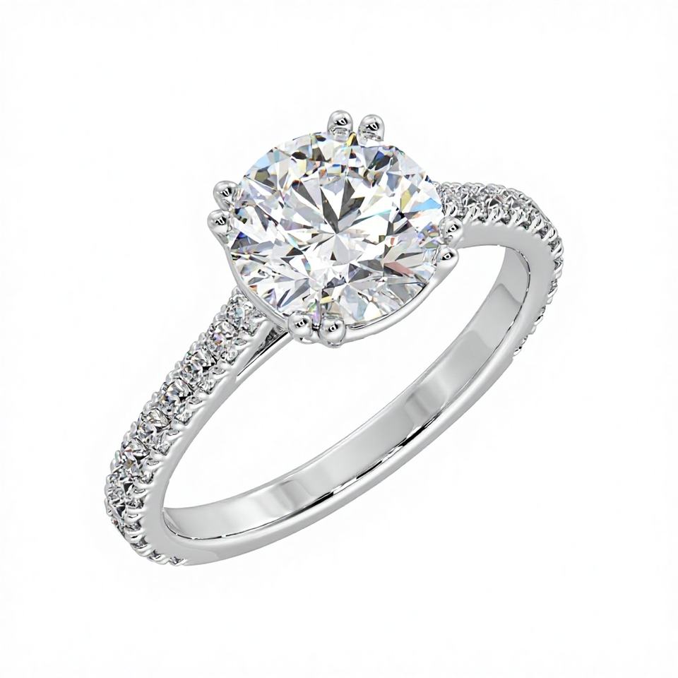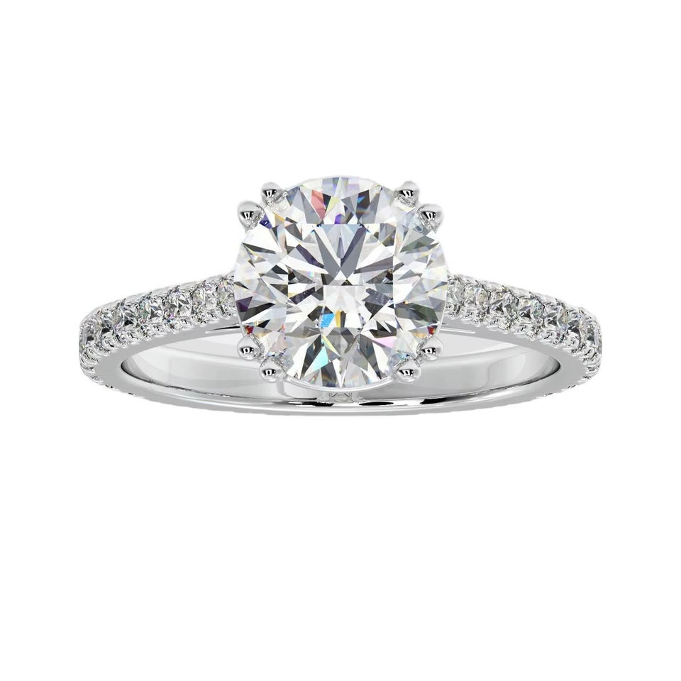 Anillo de Compromiso con Diamante Redondo de 2 Quilates, Creado en Laboratorio, con Banda Pavé y Engaste Solitario de 8 Puntas, en Oro Blanco Clásico Certificado, Ideal para Regalo de Boda