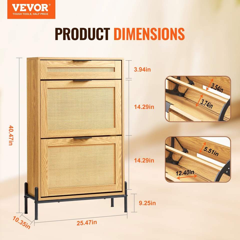 Mueble Zapatero Estrecho de Ratán con 2 Cajones Abatibles y 1 Cajón Deslizante, Organizador de Almacenamiento para Entrada con Patas Metálicas