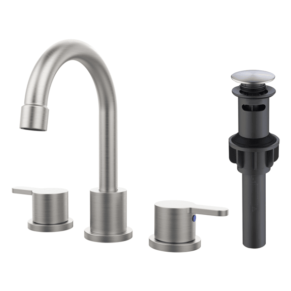 Grifo de lavabo de baño de 8 pulgadas con 2 manijas, 3 orificios, caño giratorio 360 grados, de amplio alcance, de níquel cepillado, con desagüe de botón, para lavabo de tocador