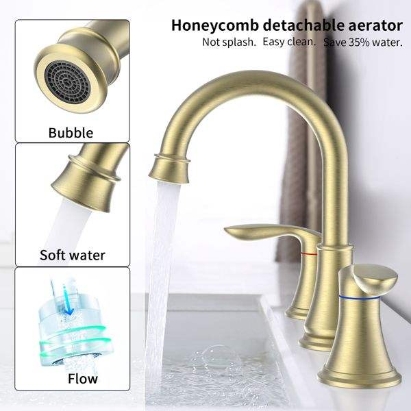 Grifo de lavabo de 8 pulgadas con 2 manijas, acabado en oro cepillado, caño giratorio 360 grados, para lavabo de baño de 3 orificios